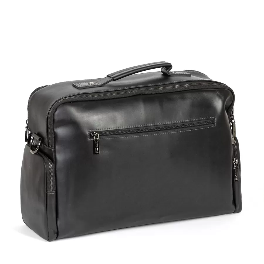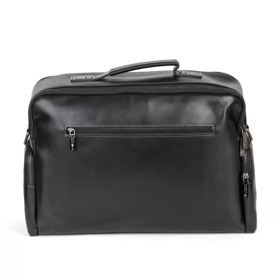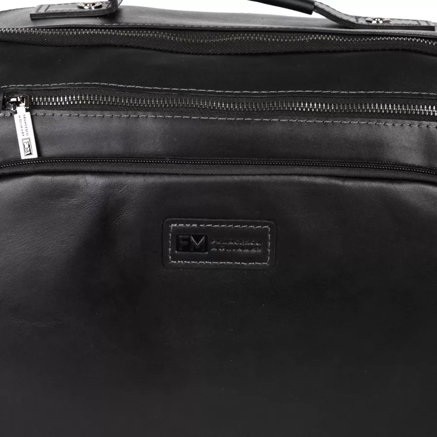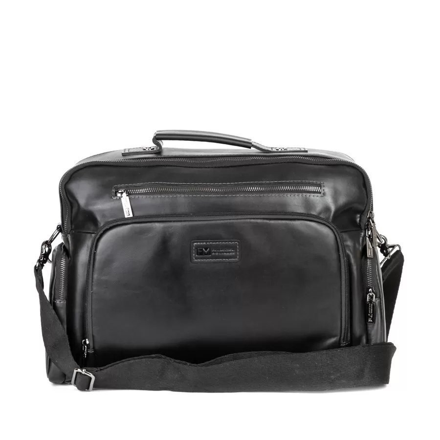 Стильная деловая сумка бренда Franchesco Mollinari из натуральной гладкой кожи черного цвета. Прошита фирменной подкладочной тканью. Имеет пришитую кожаную ручку. Внутри основное отделение под 2 молниями, отдел для ноутбука, карман на молнии и 2 кармашек для мелких вещей. На лицевой стороне есть 2 кармана на молнии. На задней стороне есть карман на молнии. По бокам 2 кармана на молнии. В комплекте есть съемный плечевой ремень