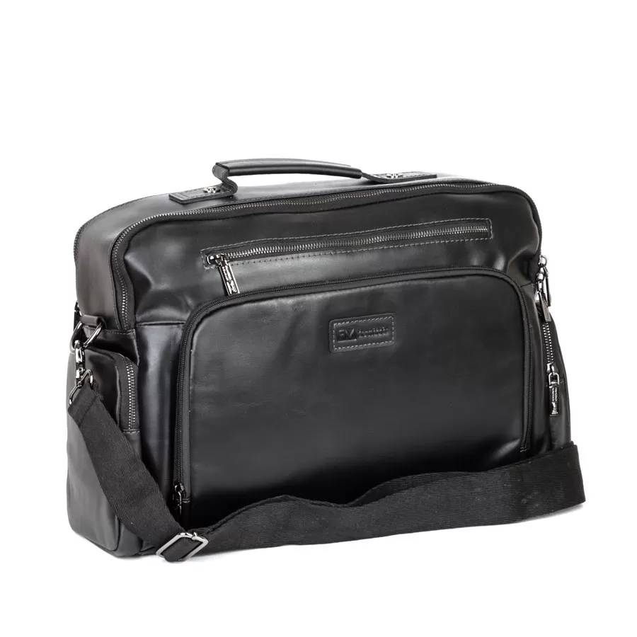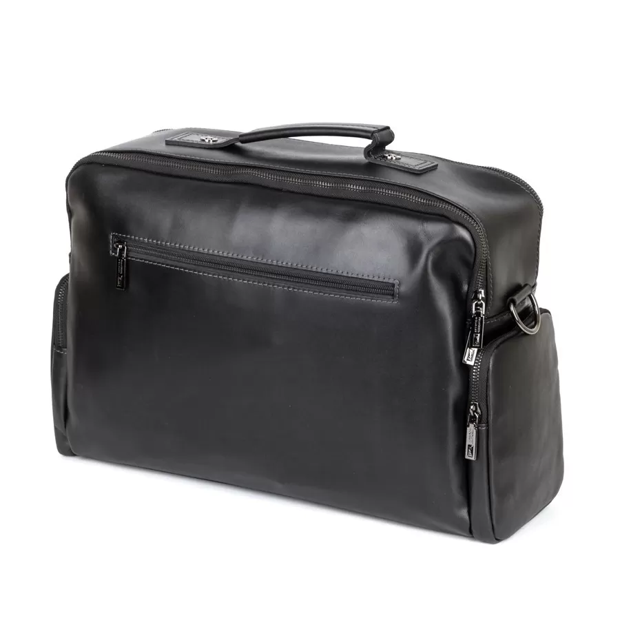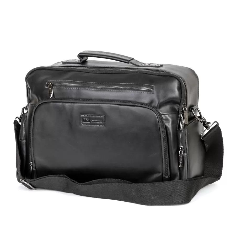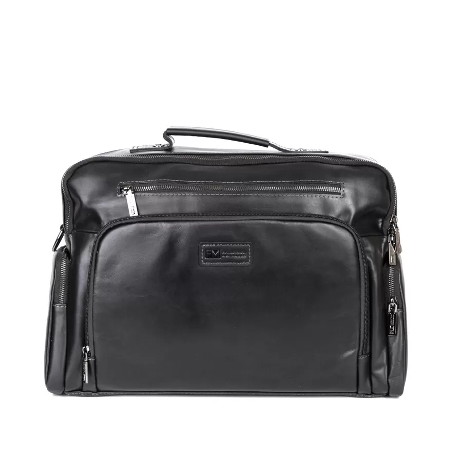 Стильная деловая сумка бренда Franchesco Mollinari из натуральной гладкой кожи черного цвета. Прошита фирменной подкладочной тканью. Имеет пришитую кожаную ручку. Внутри основное отделение под 2 молниями, отдел для ноутбука, карман на молнии и 2 кармашек для мелких вещей. На лицевой стороне есть 2 кармана на молнии. На задней стороне есть карман на молнии. По бокам 2 кармана на молнии. В комплекте есть съемный плечевой ремень