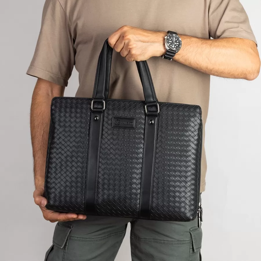 Мужская деловая сумка бренда Valigetti из искусственной кожи с плетеной структурой. Прошита фирменной подкладочной тканью. Имеет прицепные кожаные ручки. Внутри 4 отделения на молнией, средник на молнии, карман на молнии и 2 кармашка для мелких вещей, отсек для документов или планшета. В комплект входит прицепной плечевой ремень