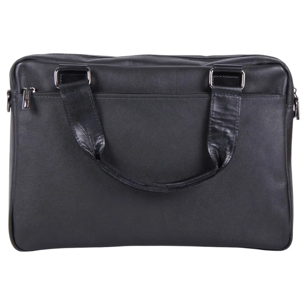 Сумка деловая от бренда Francesco Molinary выполнена из натуральной кожи черного цвета. Модель с двумя ручками и съемным плечевым ремнем из текстильного материала. Основное отделение на молнии. Внутри: фирменная подкладка, накладной карман с уплотненной стенкой для ноутбука, карман на молнии, накладной карман. На лицевой и задней сторонах - карман на молнии.