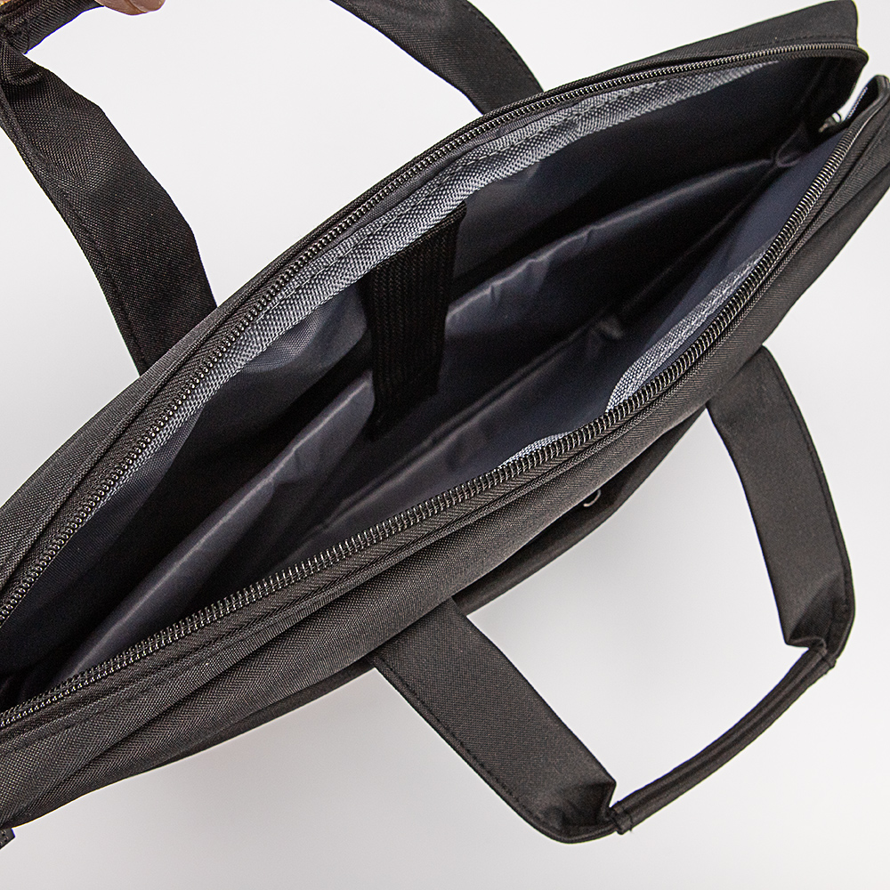 Сумка от торговой марки Ecotope из практичного текстильного материала. Плоская модель для ноутбука диагональю 16 дюймов, с двумя ручками, съемным регулируемым плечевым ремнем с мягким наплечником. Стенки сумки уплотнены. Отделение на молнии. Внутри: текстильная подкладка, накладной карман с уплотненной стенкой для ноутбука с фиксирующей резинкой. На лицевой стороне – карман на скрытой молнии. На задней стороне имеется лямка для крепления на выдвижную ручку чемодана.