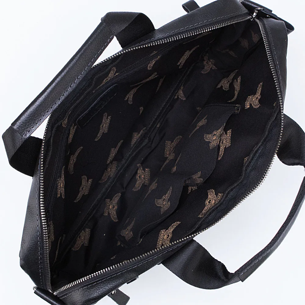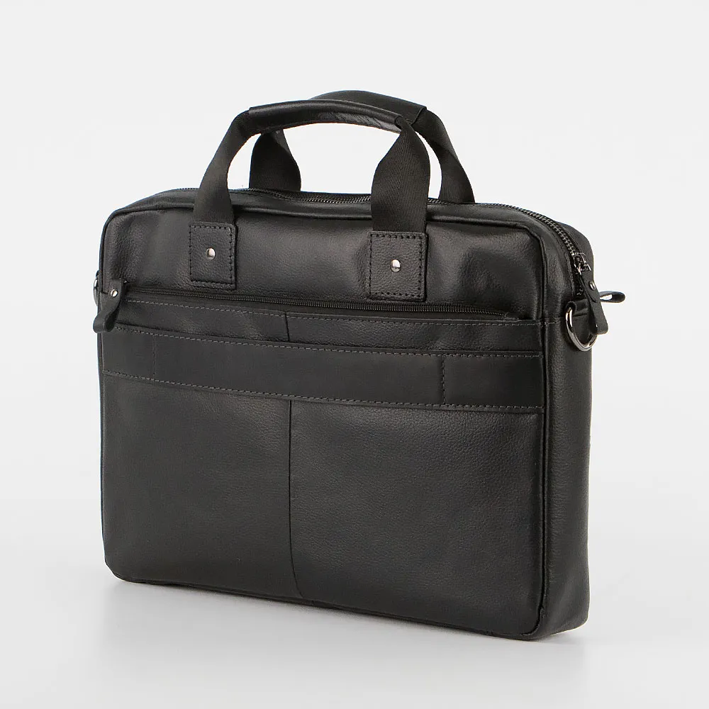 Сумка от торговой марки Poshete из натуральной кожи черного цвета. Модель с двумя ручками и съемным регулируемым плечевым ремнем. Отделение на молнии. Внутри: фирменная подкладка, карман на молнии, два накладных кармана. На лицевой стороне – два кармана на молнии. На задней стороне – карман на молнии, лямка для крепления сумки на выдвижную ручку чемодана.