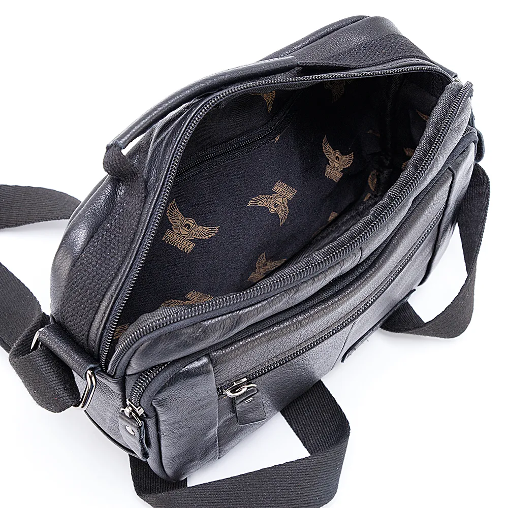 Сумка кросс-боди от торговой марки Poshete из натуральной кожи черного цвета. Модель с одной ручкой и несъемным регулируемым плечевым ремнем. Отделение на молнии с фирменной подкладкой и карманом на молнии. На лицевой стороне – два кармана на молнии, на задней – карман на молнии.