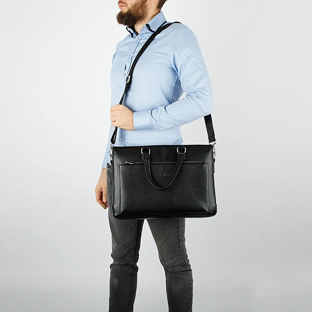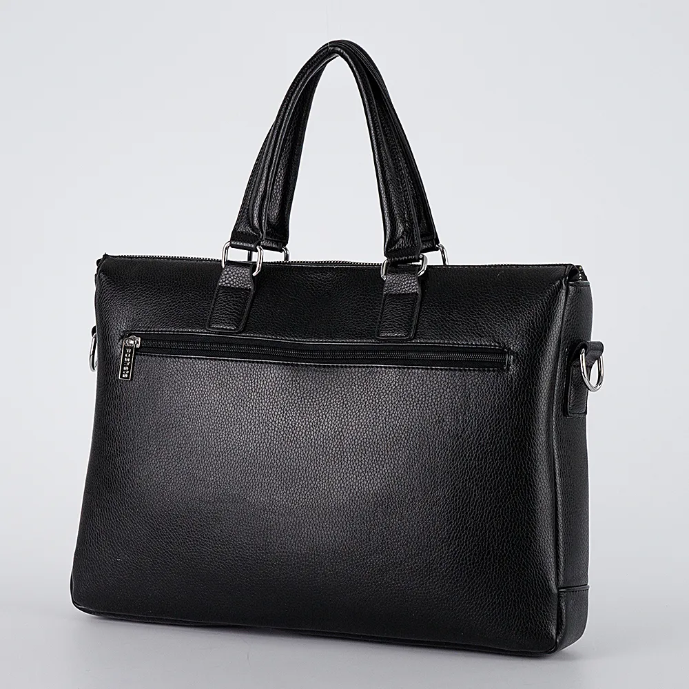 Сумка предназначена для ноутбука и документов, имеет крепкие ручки, сзади карман на молнии. Молнии основного отделения и накладного кармана спереди металлические. Модель имеет толщину и держит форму. Представлена брендом Poshete и выполнена из искусственной фактурной кожи.