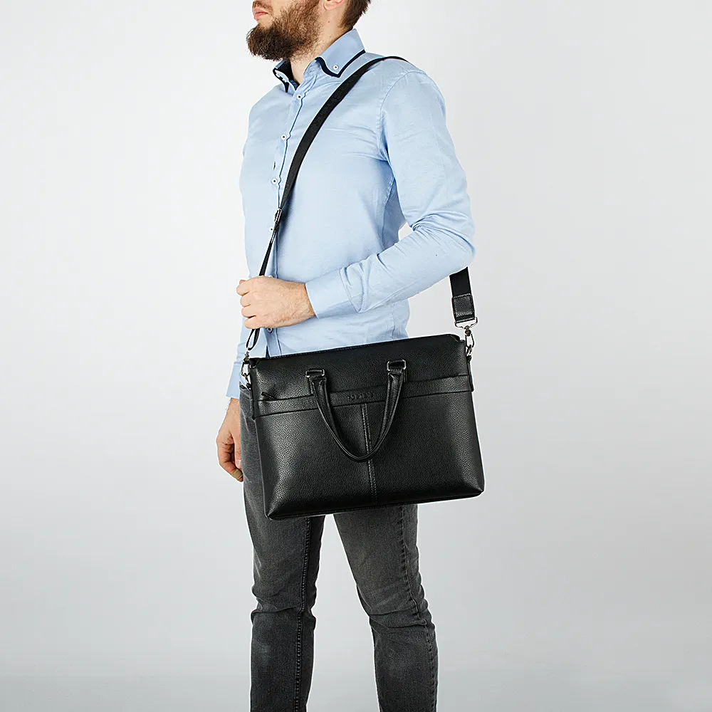Сумка предназначена для ноутбука и документов, имеет крепкие ручки, сзади карман на молнии. Основное отделение на молнии, спереди накладной карман на скрытой молнии. Модель прочно сшита, выглядит очень стильно. Представлена брендом Poshete и выполнена из искусственной фактурной кожи.