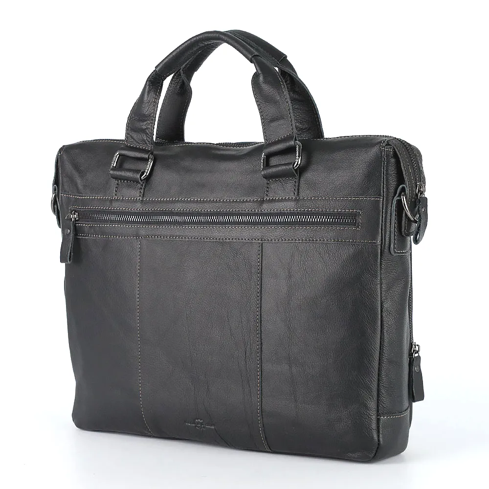 Мужская сумка под ноутбук от торговой марки Poshete выполнена из натуральной кожи черного цвета. Модель с двумя ручками и съемным регулируемым плечевым ремнем. Отделение на молнии, которая по бокам фиксируется магнитами. Внутри: подкладка, отсек для ноутбука, закрывающийся ремешком на кнопке, карман на молнии. На лицевой стороне – два кармана на молнии, на задней – карман на молнии.