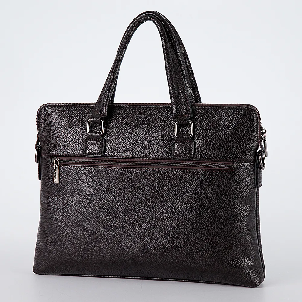 Современная мужская сумка-портфель Poshete выполнена в тёмно-коричневом цвете из мягкой и фактурной искусственной кожи. Модель в деловом стиле. Сзади прорезной карман на молнии. Спереди накладной карман на молнии, которая расстёгивается по двум сторонам. Основное отделение на молнии, внутри три дополнительных кармашка и отсек на липучке для ноутбука. Сумка имеет две эргономичные ручки и плечевой текстильный ремень, съёмный, регулируемый.