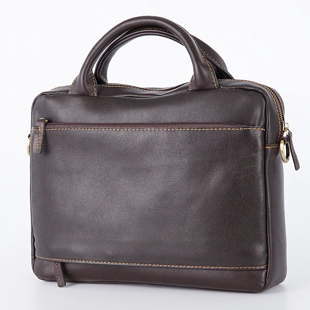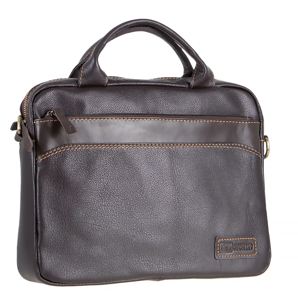 Стильная компактная сумка от бренда Francesco Molinary выполнена из натуральной крупнозернистой кожи коричневого цвета. Модель прямоугольной формы, с двумя ручками и съемным регулируемым плечевым ремнем. Отделение на молнии, с текстильной подкладкой. Внутри: карман на молнии, два накладных кармана и отделение на кнопке для планшета или ноутбука. На передней стороне – карман на молнии. На задней – карман на молнии, с дополнительной молнией по низу. С расстегнутыми молниями карман превращается в шлевку для крепления на выдвижную ручку чемодана. Сумка декорирована контрастной отстрочкой, вставкой из гладкой кожи; спереди имеется нашивка с названием бренда.