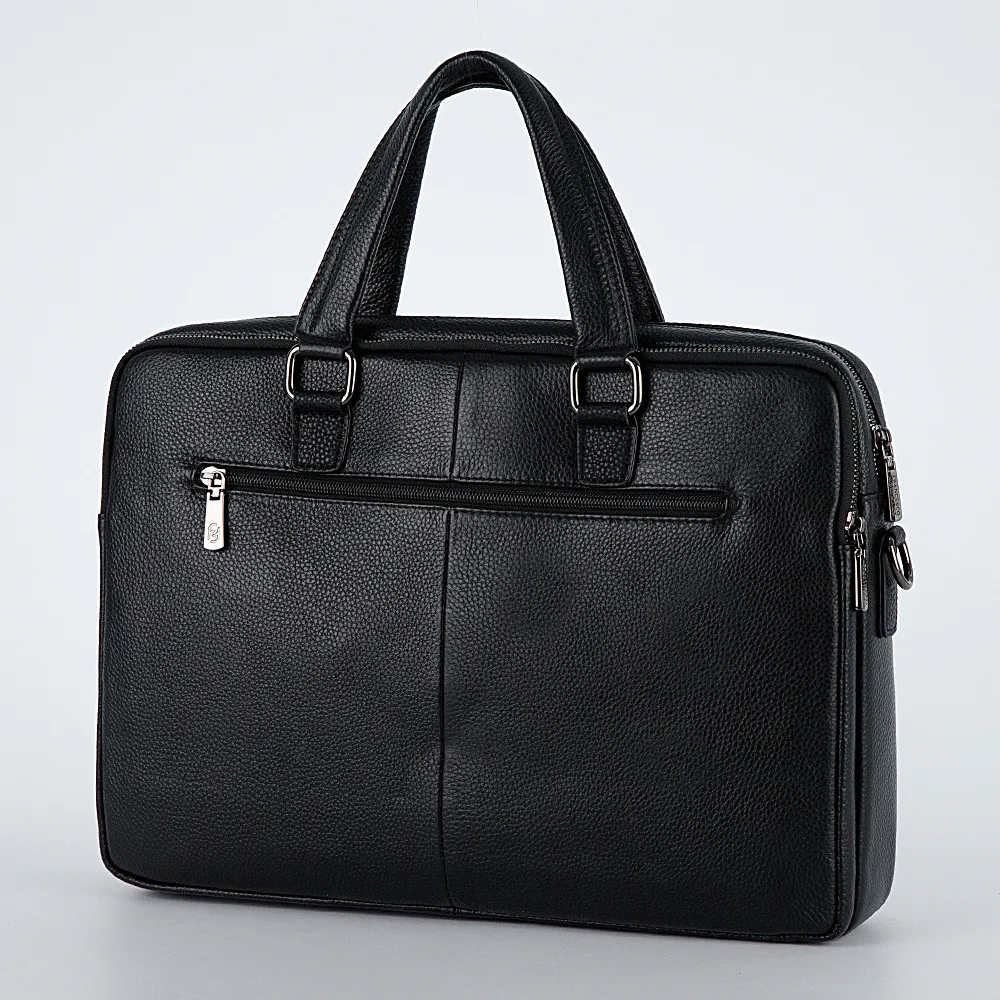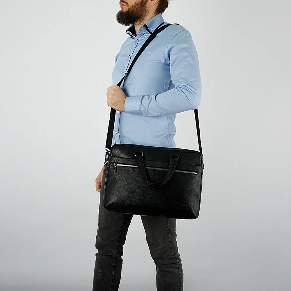 Деловая сумка от торговой марки Francesco Molinary из натуральной кожи черного цвета. Модель с двумя ручками и съемным регулируемым плечевым ремнем. Два отделения на молнии с фирменной подкладкой. В основном отделении: карман на молнии, карман для ноутбука с уплотненной стенкой. На лицевой стороне – два кармана на молнии. На задней – карман на молнии.