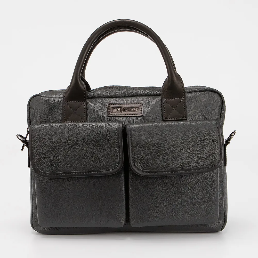 Сумка от торговой марки Francesco Molinary из натуральной кожи черного цвета. Модель с двумя ручками и съемным регулируемым плечевым ремнем. Отеление на молнии, внутри фирменная подкладка, накладной карман, карман на молнии и отделение для ноутбука с хлястиком на кнопке. На лицевой стороне два накладных кармана на магнитной кнопке. На задней стороне - карман на молнии, который можно использовать как лямку для крепления на ручку чемодана.
