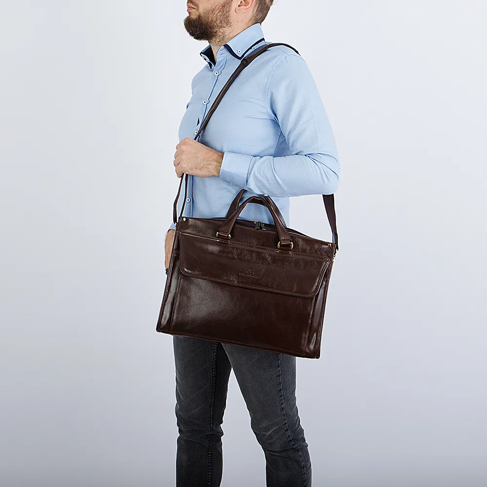 Деловая сумка-портфель от бренда Francesco Molinary из натуральной гладкой кожи. Модель с двумя отделениями под молнией с двойным ходом, внутри карман на молнии, два накладных кармана под телефон и канцелярские принадлежности. Снаружи накладной карман под крышкой на магните и прорезной карман под молнией. Дно портфеля снабжено металлическими ножками для защиты от износа. К модели прилагается съемный регулируемый плечевой ремень с кожаной вставкой.