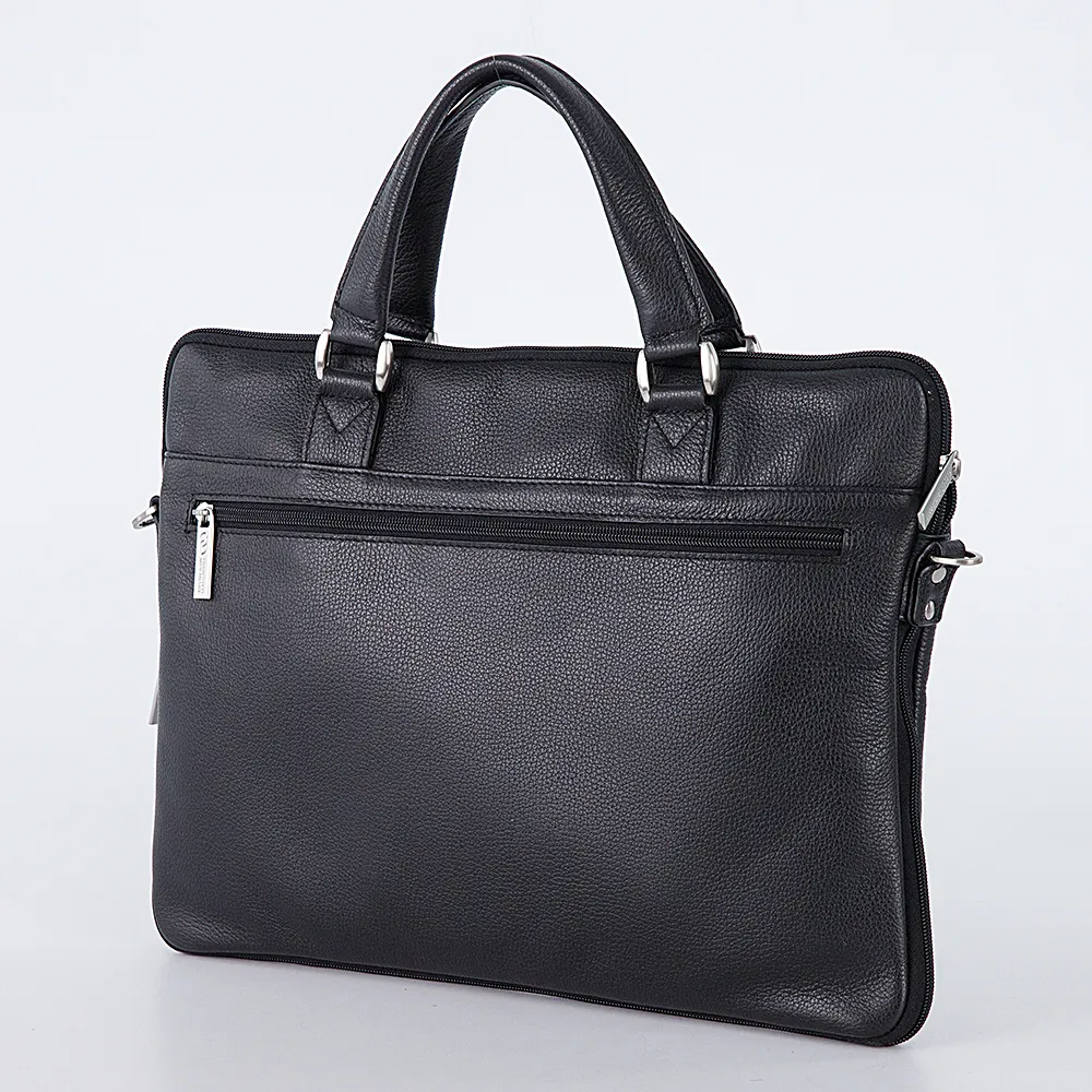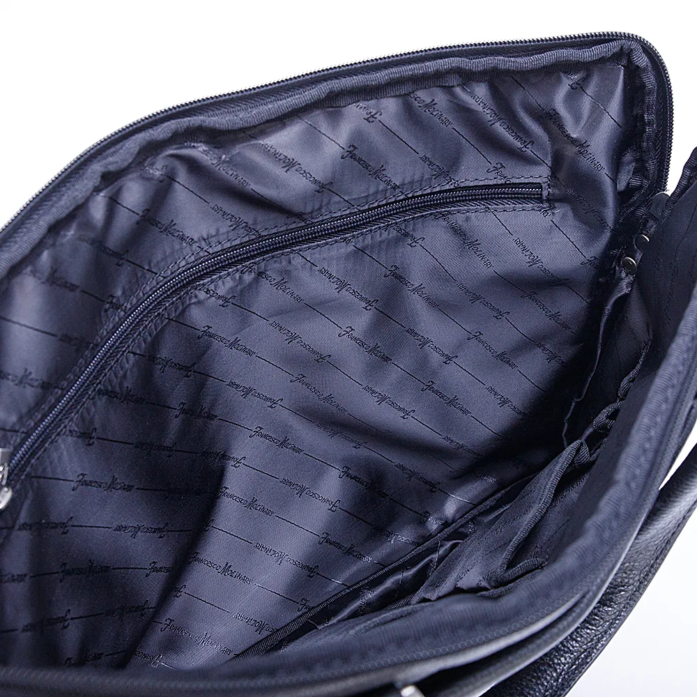 Сумка в деловом стиле от торговой марки Francesco Molinary из натуральной мягкой кожи черного цвета. Модель с двумя ручками и съемным регулируемым плечевым ремнем. Отделение на молнии, с уплотненными стенками. Внутри: фирменная подкладка, карман на молнии, органайзер из накладных карманов. В нижней части имеется молния для увеличения объема. Размер подойдет для документов формата А4. На лицевой и задней сторонах – карман на молнии.