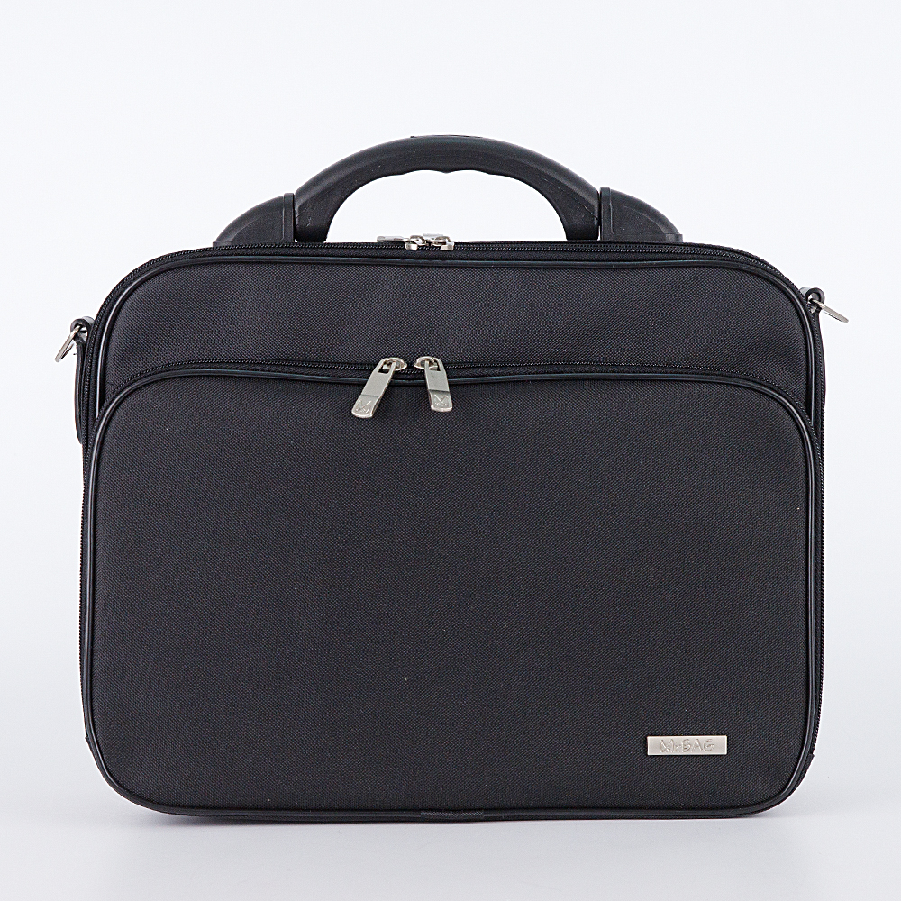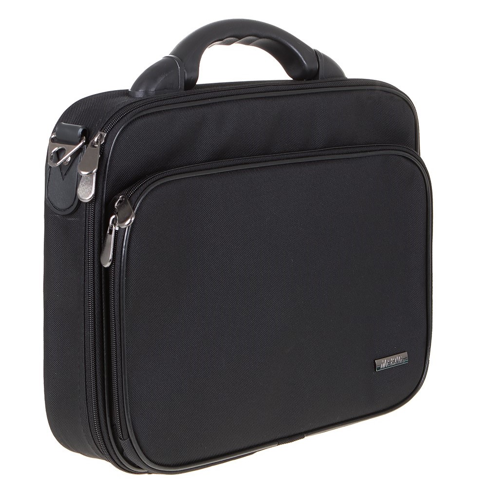 Кейс от торговой марки Mr.Bag выполнен из плотного текстильного материала черного цвета. Модель с плотной пластиковой ручкой и съемным регулируемым плечевым ремнем. Отделение на молнии по трем сторонам, что обеспечивает широкое раскрытие. Внутри: текстильная подкладка. На лицевой стороне – карман на молнии. Вес – 1,1 кг.