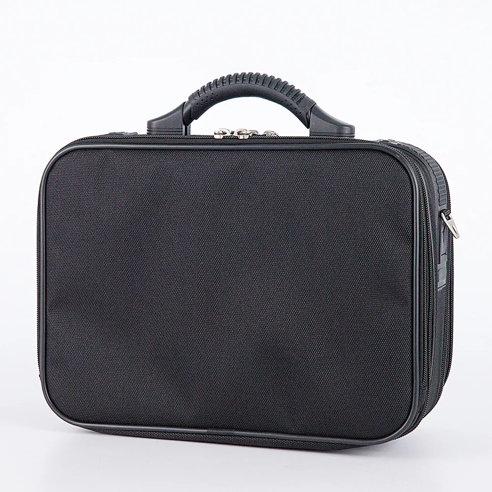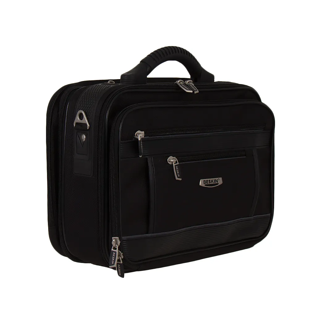 Деловой кейс от торговой марки Beskin из практичного долговечного полиэстера черного цвета с декоративными вставками из искусственной кожи. Модель среднего размера с удобной ручкой из ударопрочного пластика и съемным регулируемым плечевым ремнем с наплечником. Три отделения на молнии с текстильной подкладкой. Заднее отделение для документов с плотной перегородкой разделителем. Среднее вместительное отделение с перекрестными эластичными фиксирующими ремнями на застежке фастекс, карманом на молнии и двумя накладными карманами. В переднем отделении – органайзер для канцелярских принадлежностей, вместительный накладной карман. На лицевой стороне – два кармана на молнии. Вес кейса – 1,5 кг. Имеется раздвижка для увеличения объема с 16 до 20 литров. На углах – защитные прорезиненные накладки. Дно оснащено пластиковыми ножками для защиты от износа.