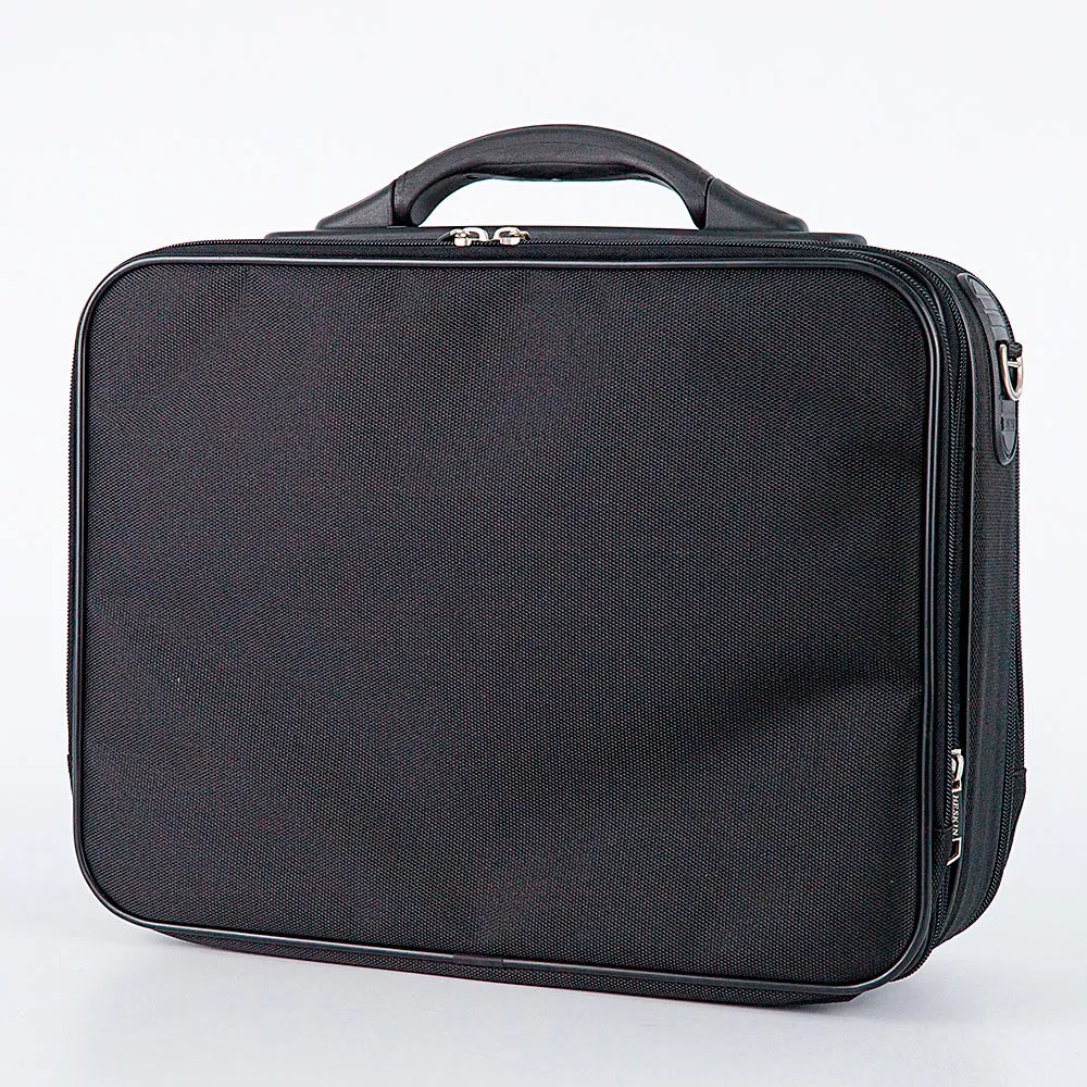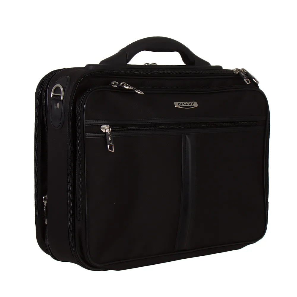 Большой деловой кейс от торговой марки Beskin из практичного долговечного полиэстера черного цвета с декоративными вставками из искусственной кожи. Модель с удобной пластиковой ручкой и съемным регулируемым плечевым ремнем с наплечником. Три отделения на молнии с текстильной подкладкой. Заднее отделение для документов с плотной перегородкой разделителем. Среднее вместительное отделение с перекрестными эластичными фиксирующими ремнями на застежке фастекс, карманом на молнии и двумя накладными карманами. В переднем отделении – органайзер для канцелярских принадлежностей. На лицевой стороне – карман на молнии. Вес кейса – 1,48 кг. Имеется раздвижка для увеличения объема с 23 до 30 литров. Дно оснащено крупными пластиковыми ножками для защиты от износа.