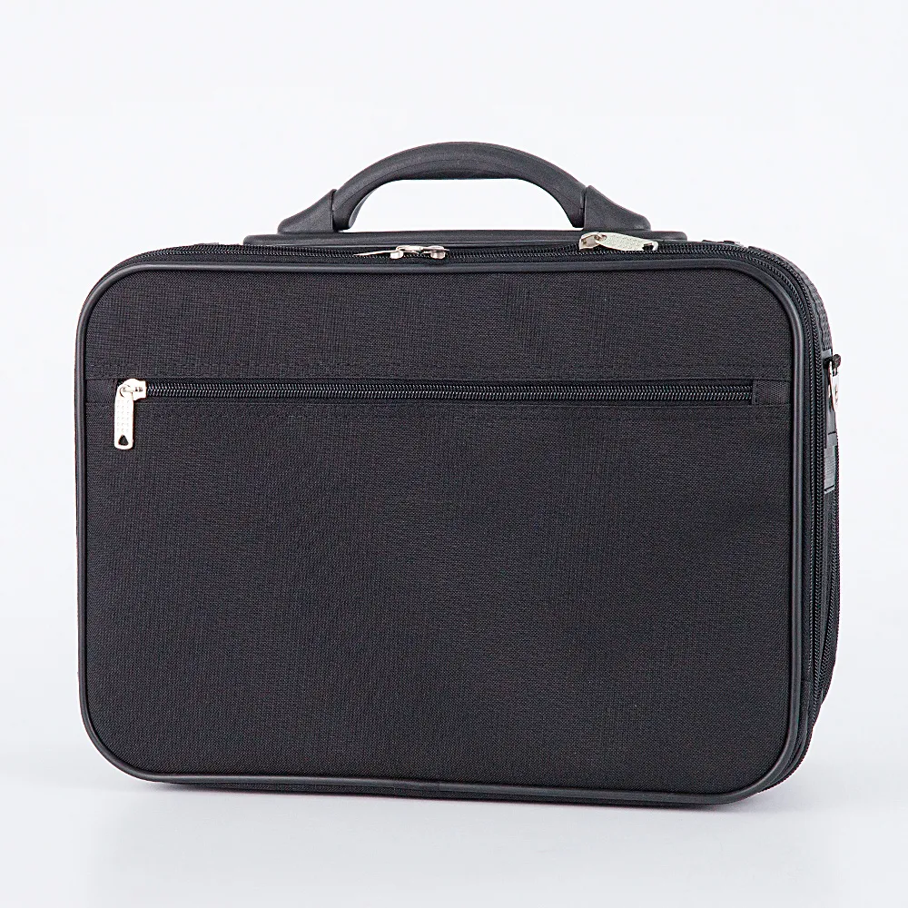 Мужской кейс от торговой марки Rosin из прочного текстильного материала черного цвета. Каркасная модель с широкой пластиковой ручкой и съемным плечевым ремнем. В основном отделении – фиксирующие перекрестные ремни. Два отделения на молнии. Имеется раздвижка на молнии для увеличения объема. На лицевой стороне - вместительный карман с органайзером и два кармана на молнии. На задней стороне – карман на молнии.