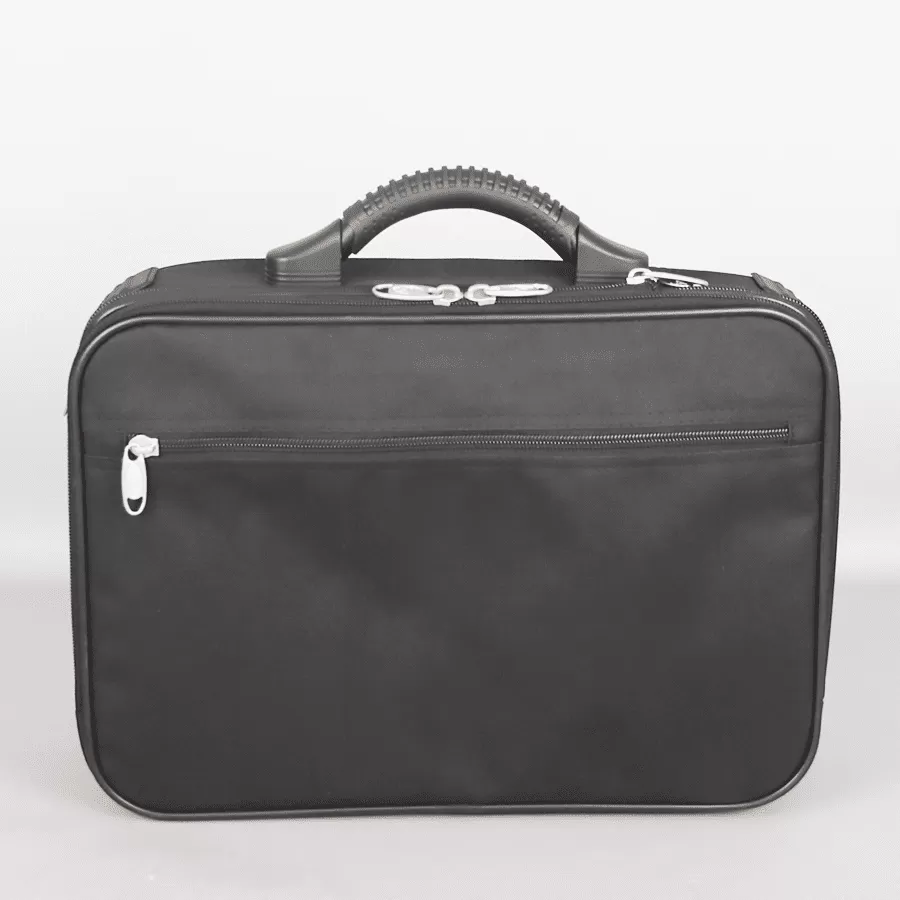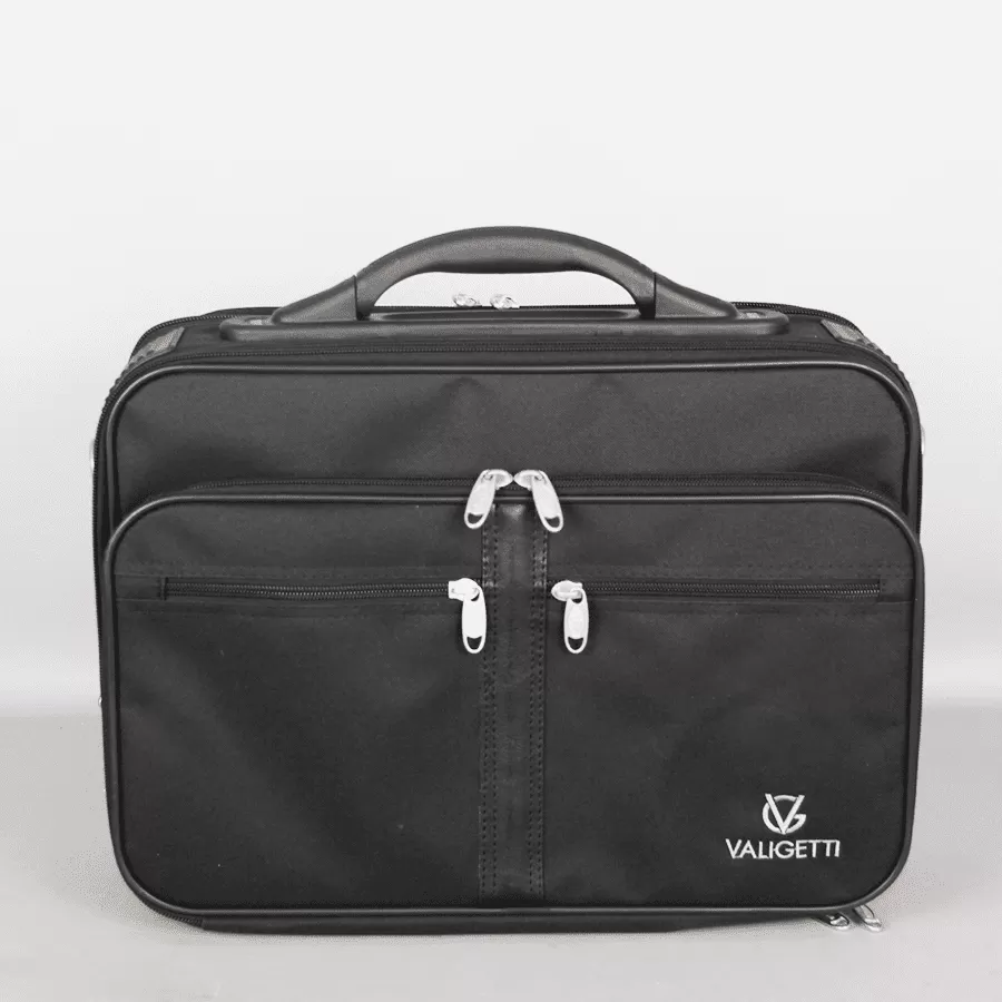 Классический мужской портфель Valigetti изготовлен из прочного текстильного материала. Его дополняют серебристые металлические детали, к модели прилагается съемный регулируемый плечевой ремень.