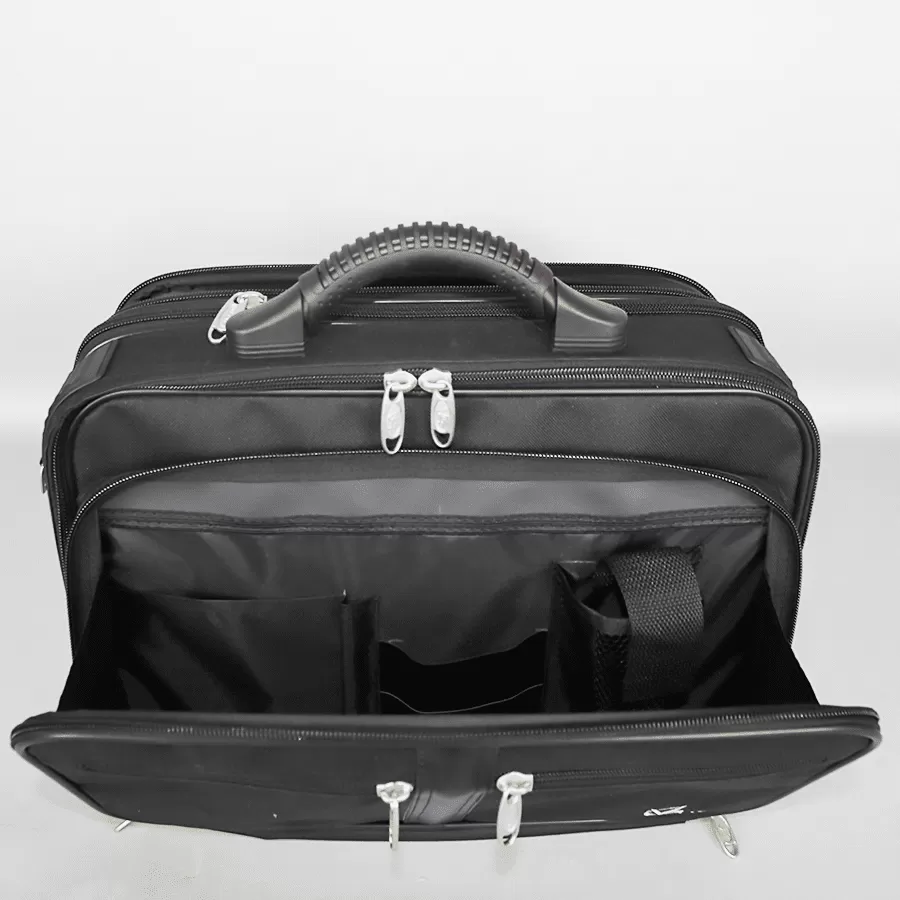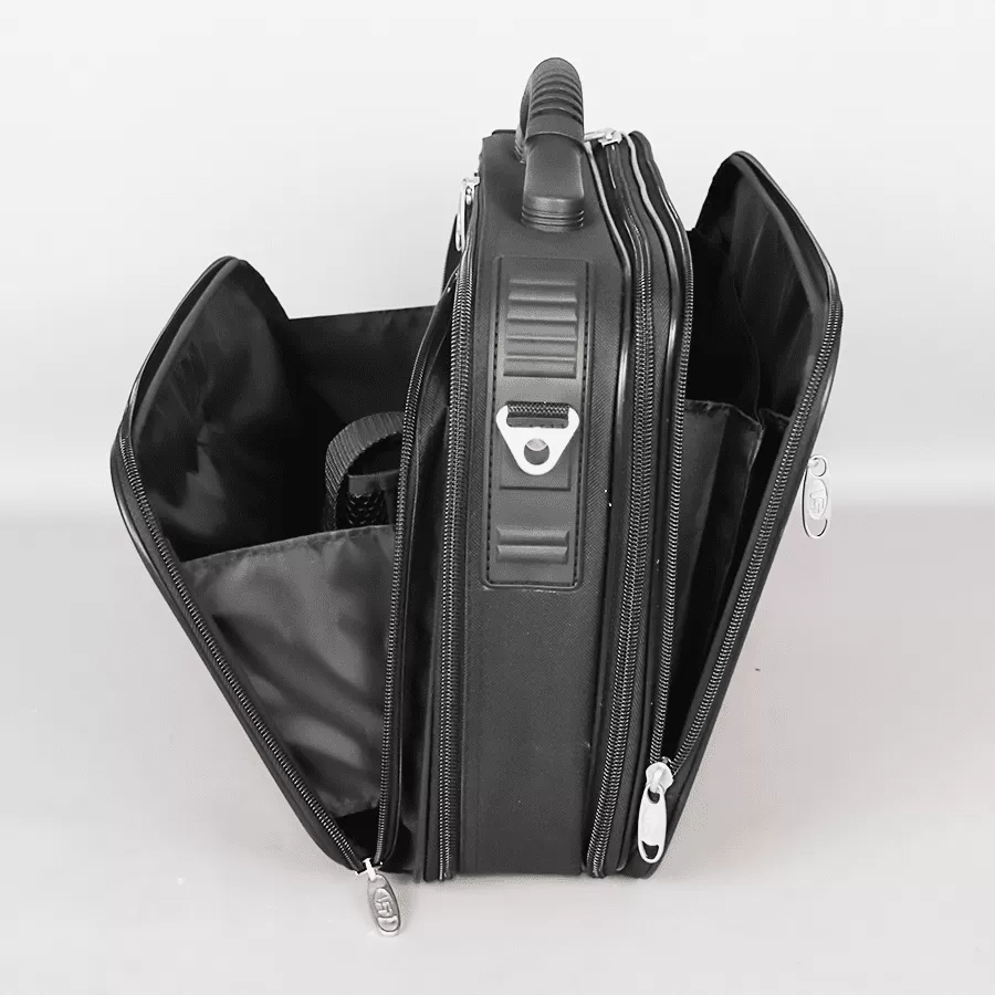 Модель оснащена молнией, с помощью которой можно регулировать объём портфеля.
