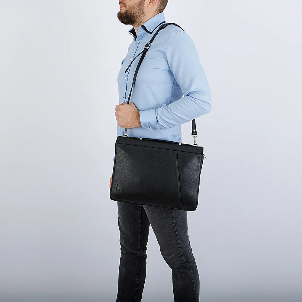 Деловая папка от Francesco Molinary выполнена из натуральной кожи в чёрном цвете. Оснащена плечевым ремнем и ручкой для переноски. Застёгивается на молнию по трем сторонам. Внутри текстильная подкладка и специализированные карманы.