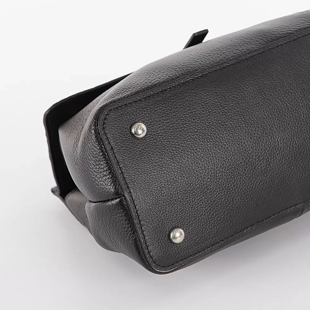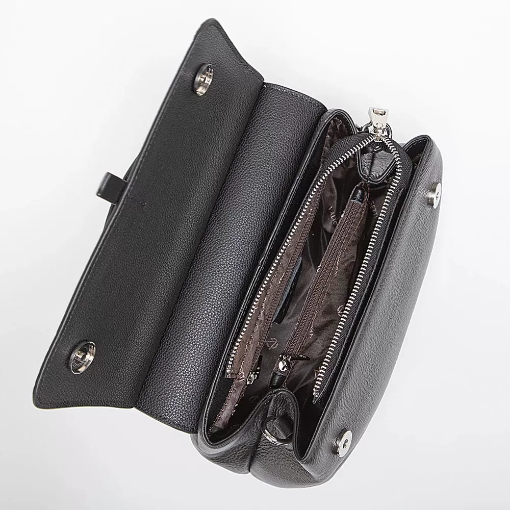 Сумка от Valigetti выполнена из натуральной кожи черного цвета. Она оснащена одной короткой ручкой и двумя съемными регулируемыми плечевыми ремнями, один из которых изготовлен из текстильного материала.