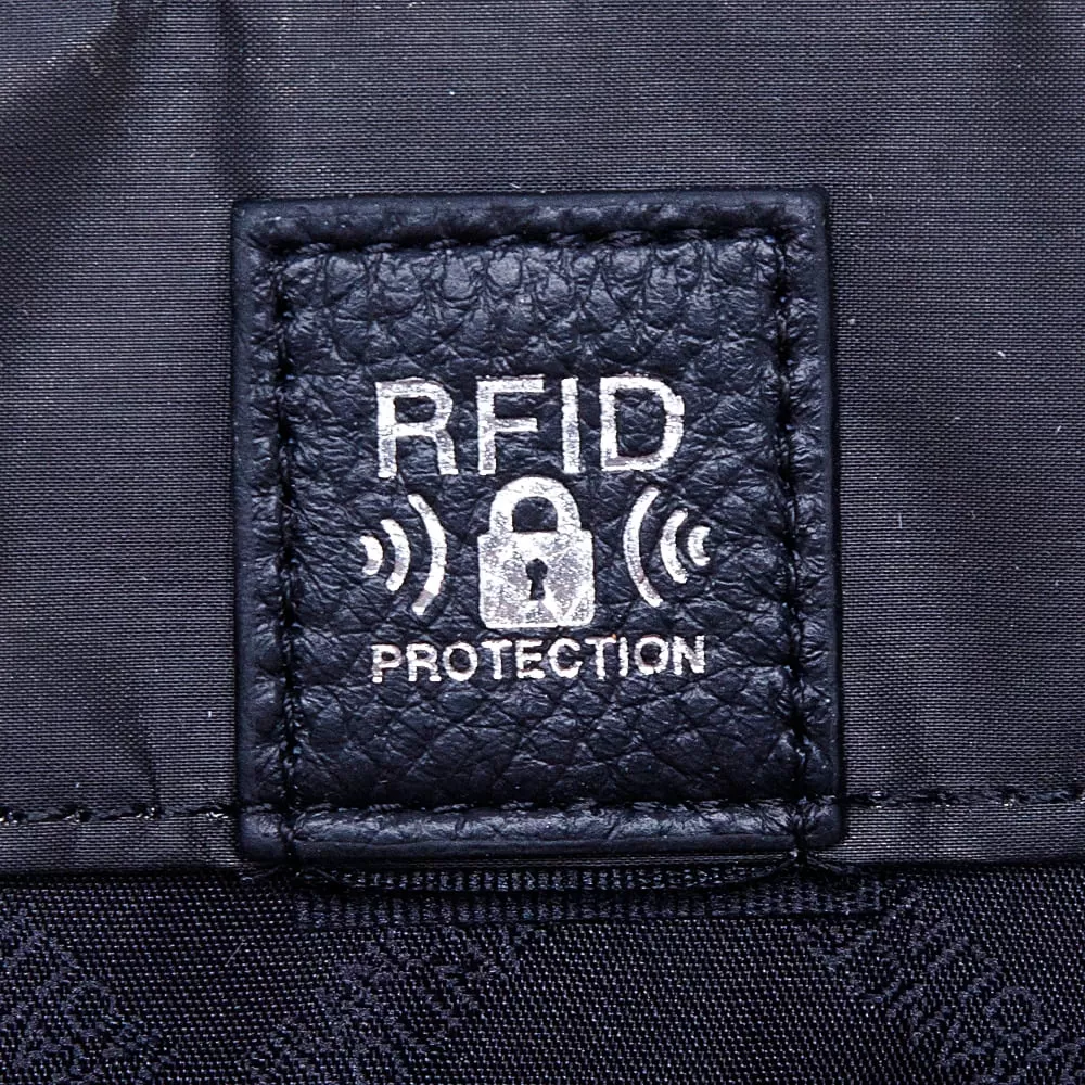 Внутри сумки вы найдете фирменную подкладку, а также два накладных кармана и один с клапаном на липучке. Этот накладной карман оснащен RFID-защитой, что предотвращает считывание банковских карт. На задней стороне сумки расположен карман на молнии.