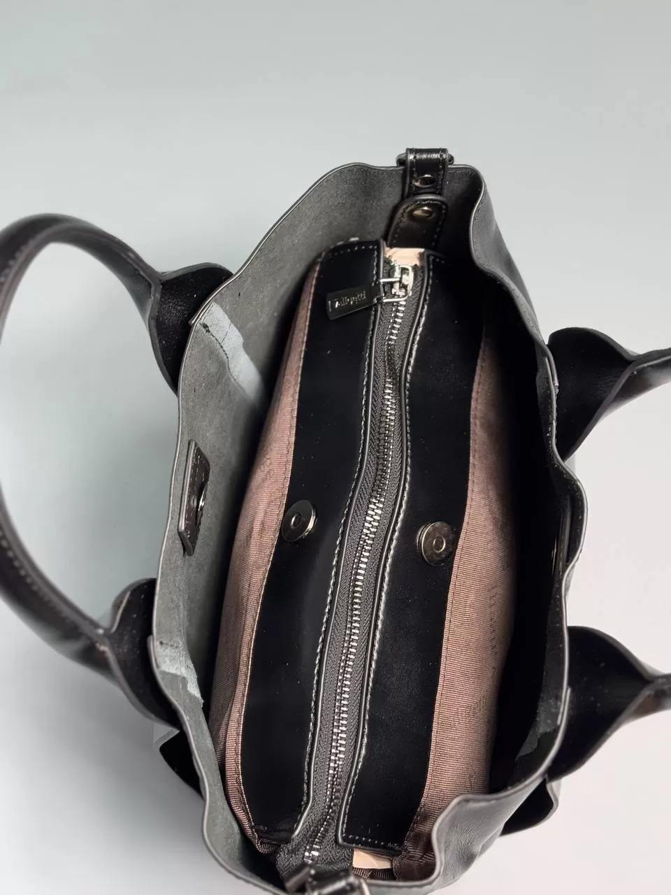 В основном отделении есть фирменная подкладка, открытый карман и карман на молнии. Для защиты от износа и повреждений на дне сумочки предусмотрены ножки.