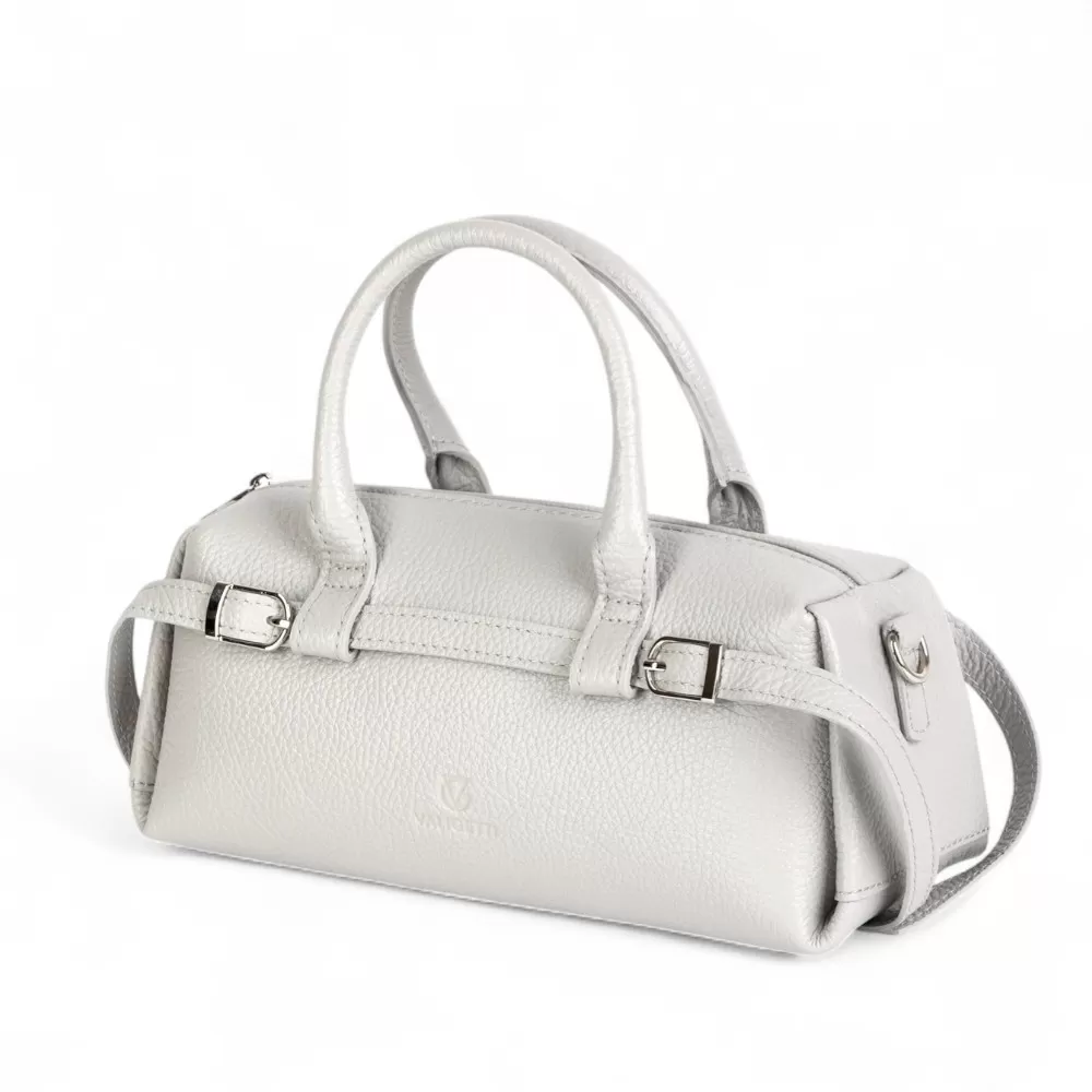 Сумка из натуральной кожи бренда Valigetti. Она оснащена съёмным плечевым ремнём. Внутри одно отделение на молнии с карманом и текстильной подкладкой. Украшена серебряной фурнитурой.