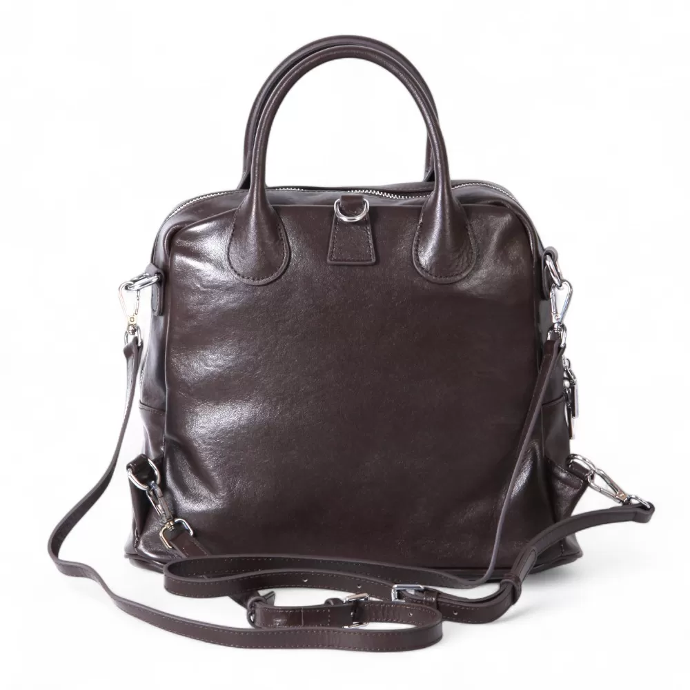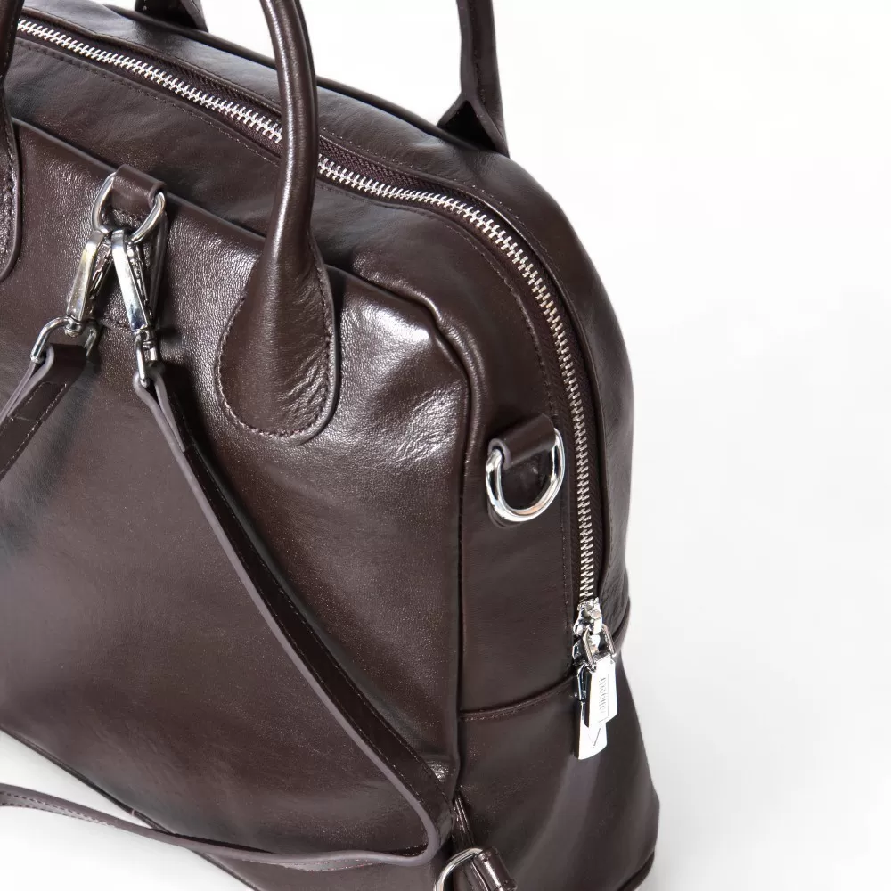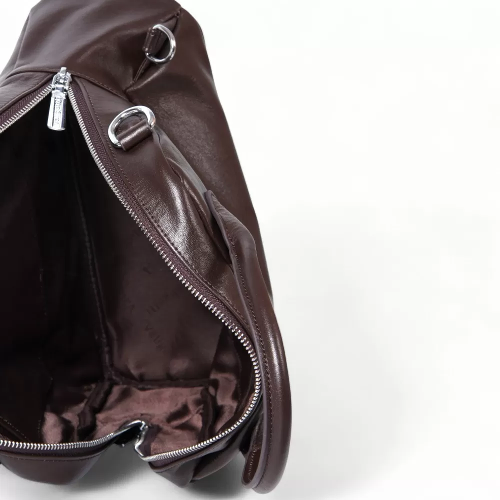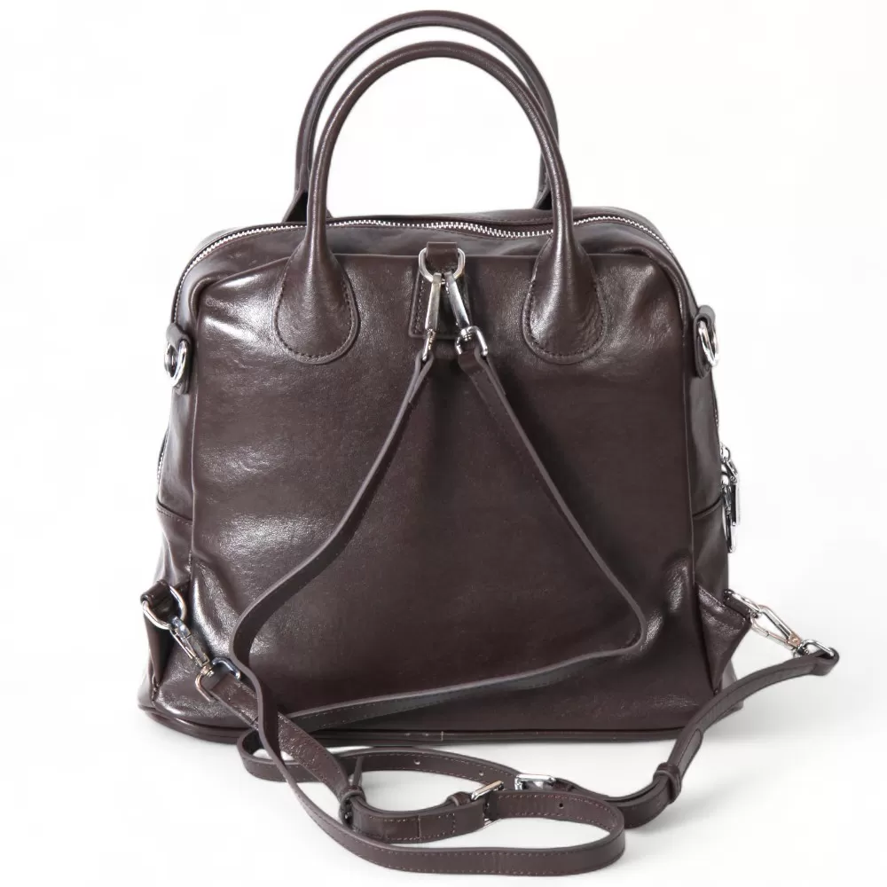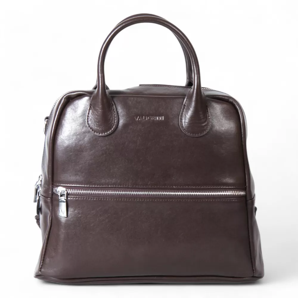 Сумка-рюкзак от Valigetti выполнена из натуральной кожи и представлена в темно-коричневом цвете. У модели две ручки и плечевой ремень, который можно использовать как лямки рюкзака или как традиционный плечевой ремень. На передней части расположен горизонтальный карман на молнии. Внутри — основное отделение с фирменной подкладкой, накладной карман и два кармана на молнии.