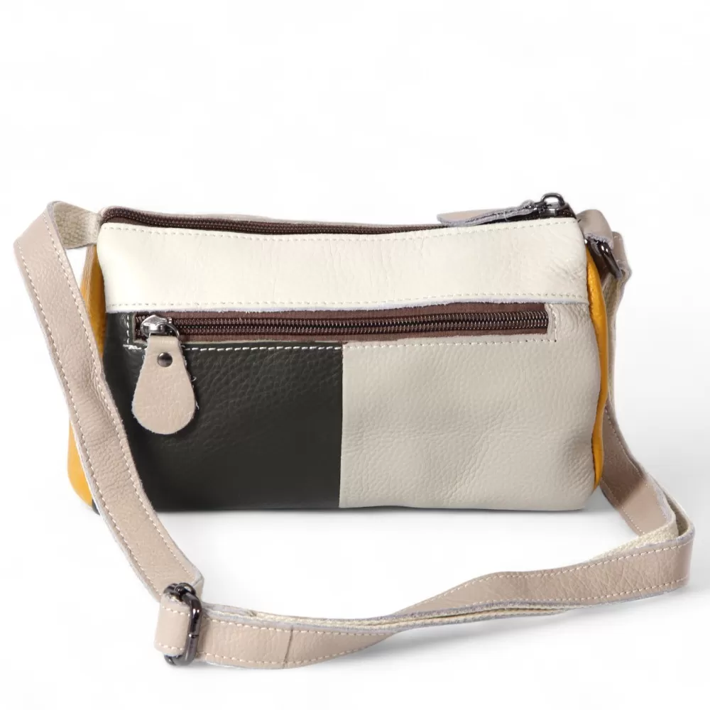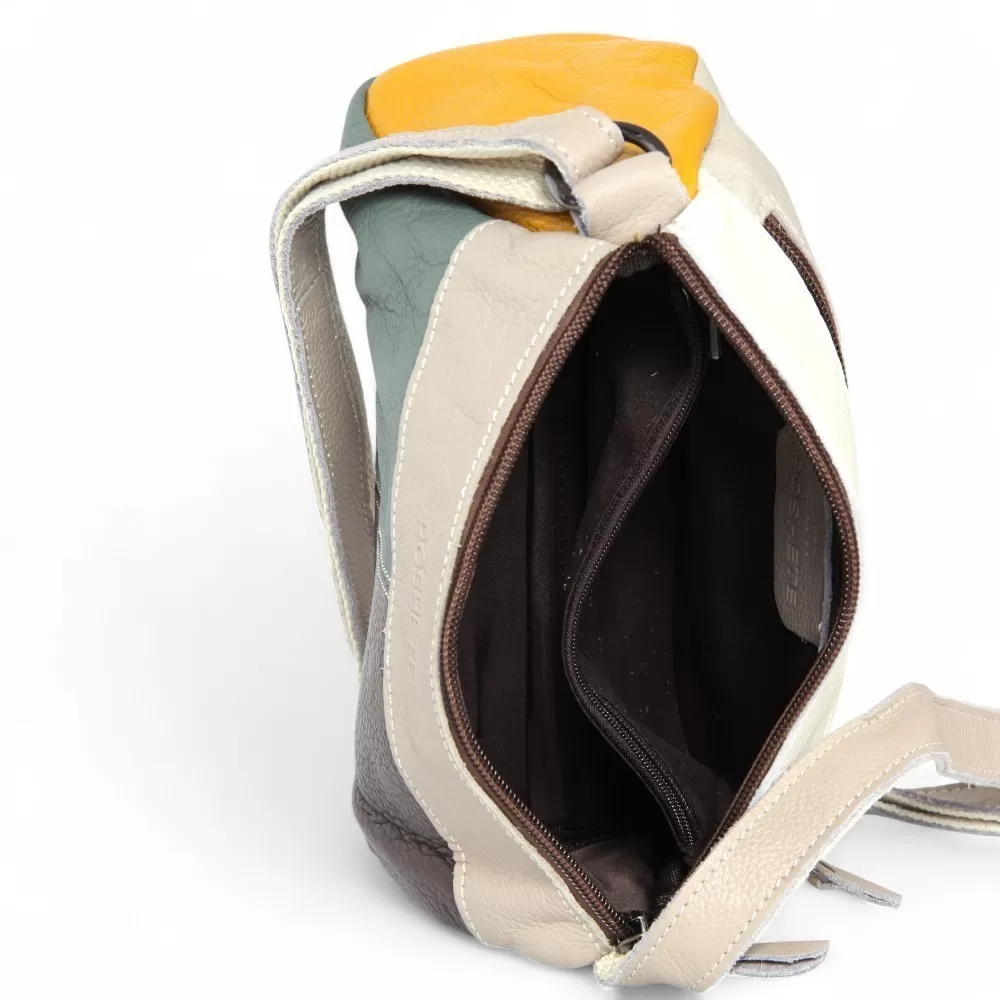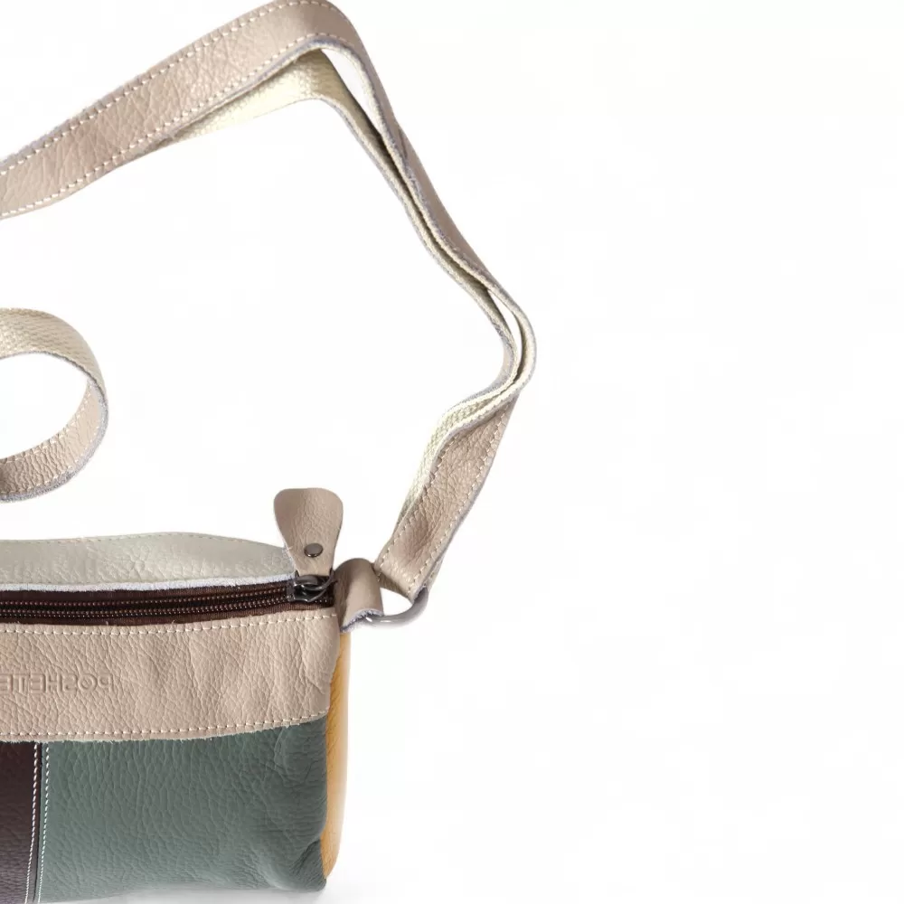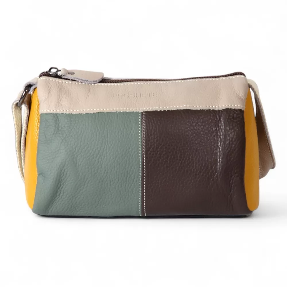 Сумка от бренда Poshete выполнена из натуральной мягкой кожи мульти цвета. Модель с несъемным регулируемым плечевым ремнем, на задней стороне расположен горизонтальный карман быстрого доступа на молнии, сумочка имеет одно основное отделение на молнии, внутри: текстильная подкладка, боковой карман на молнии, средний карман на молнии и боковой накладной открытый карман.