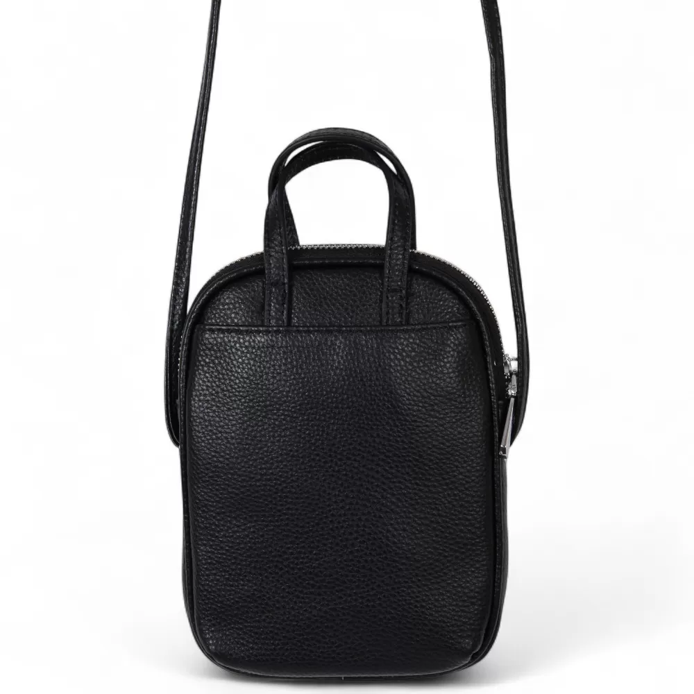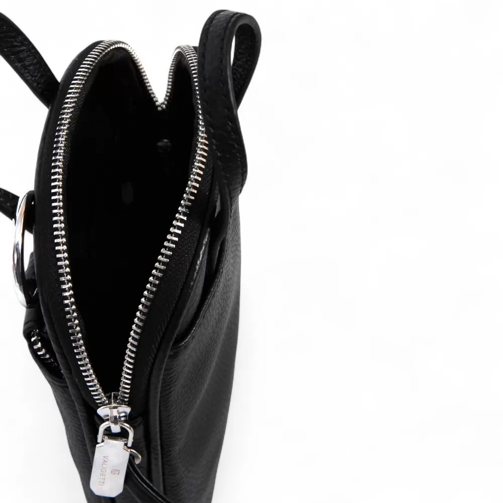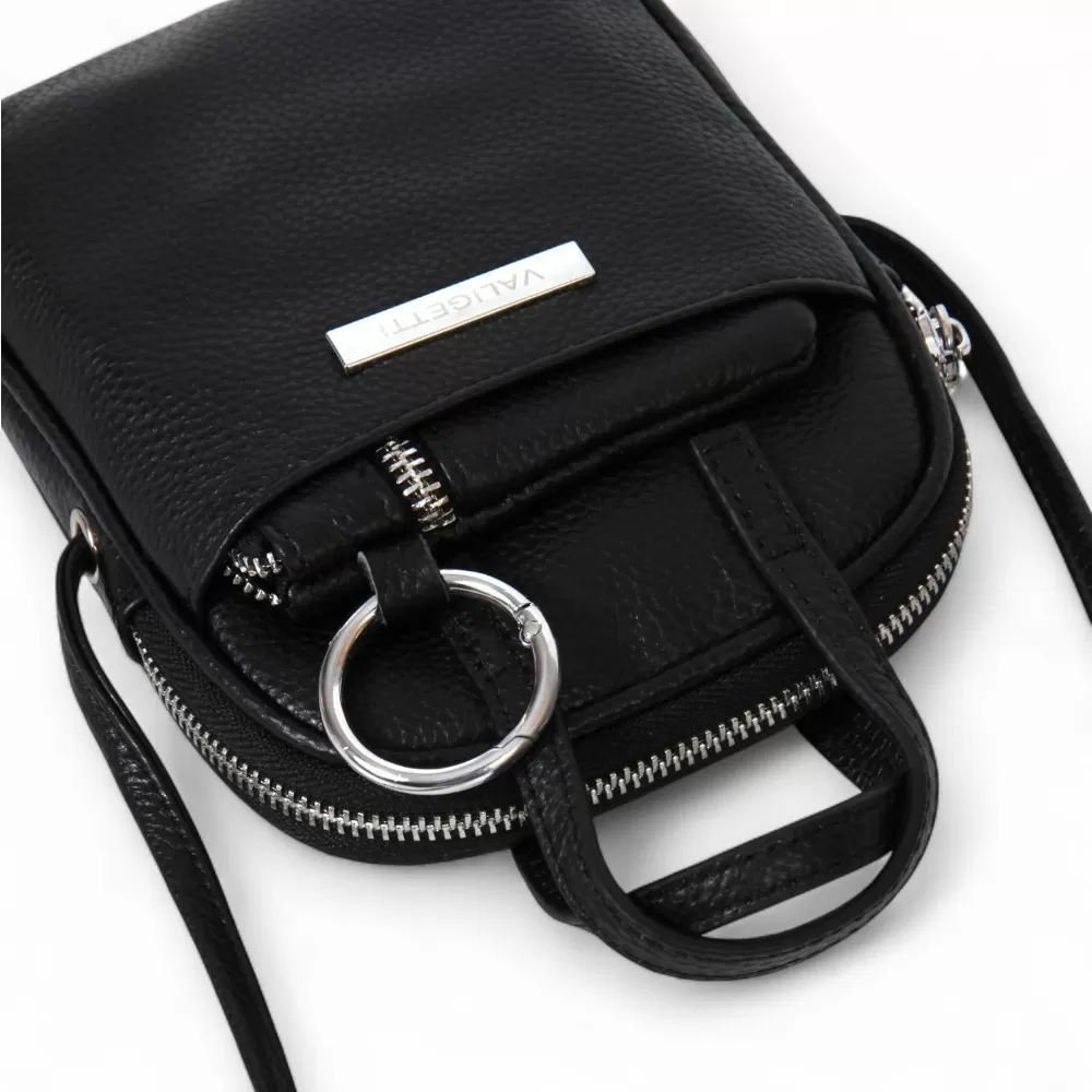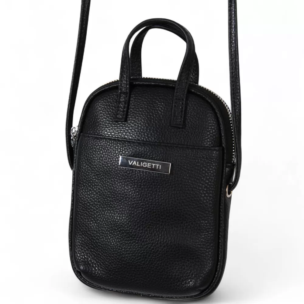 Сумка от бренда Valigetti выполнена из натуральной кожи выполнена в черном цвете. Модель с двумя ручками и регулируемым плечевым ремнем. Сзади и спереди два накладных кармана на молнии. Основное отделение закрывается на молнию. Внутри — фирменная текстильная подкладка. Есть один накладной открытый карман. В комплекте — подвесной кошелек.