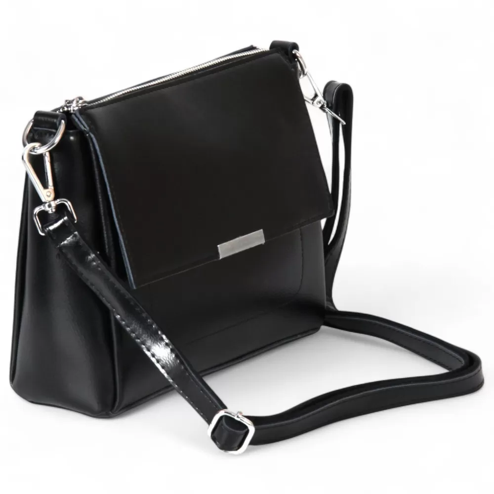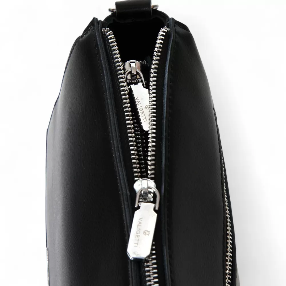 Сумка от бренда Valigetti из натуральной кожи черного цвета. Модель со съемной ручкой и съемным регулируемым плечевым ремнем. Отделение на молнии. Внутри: три отсека, средний — на молнии, фирменная подкладка, карман на молнии, накладной карман. На задней стороне — карман на молнии.