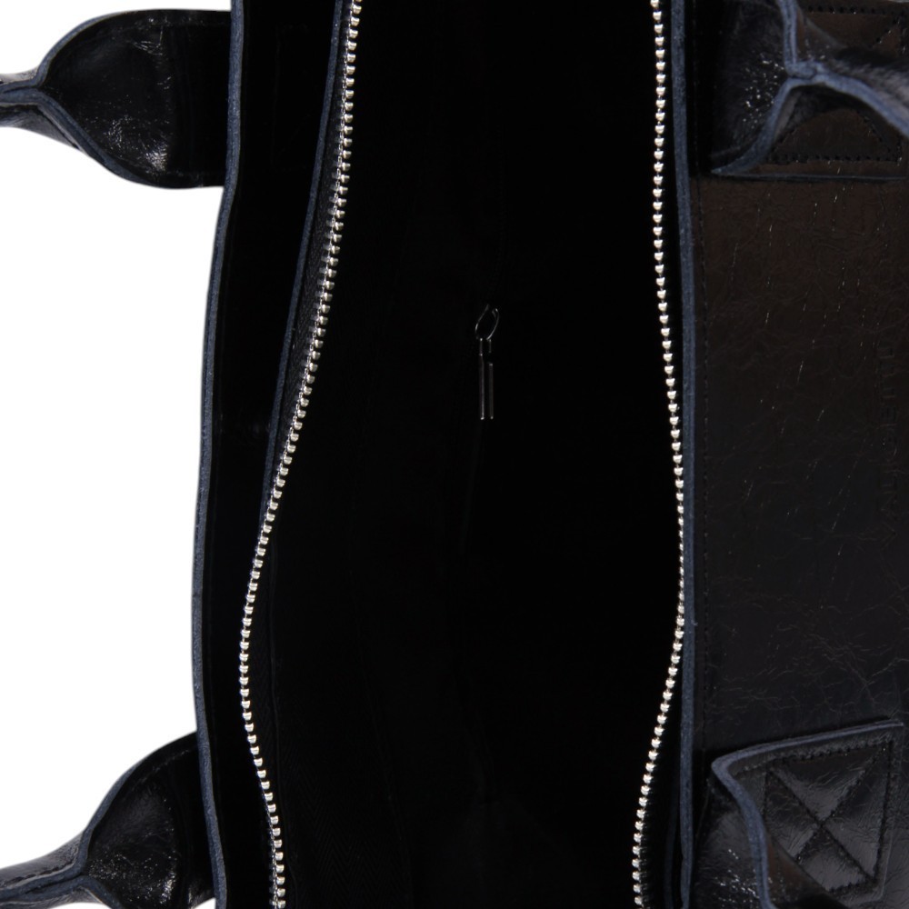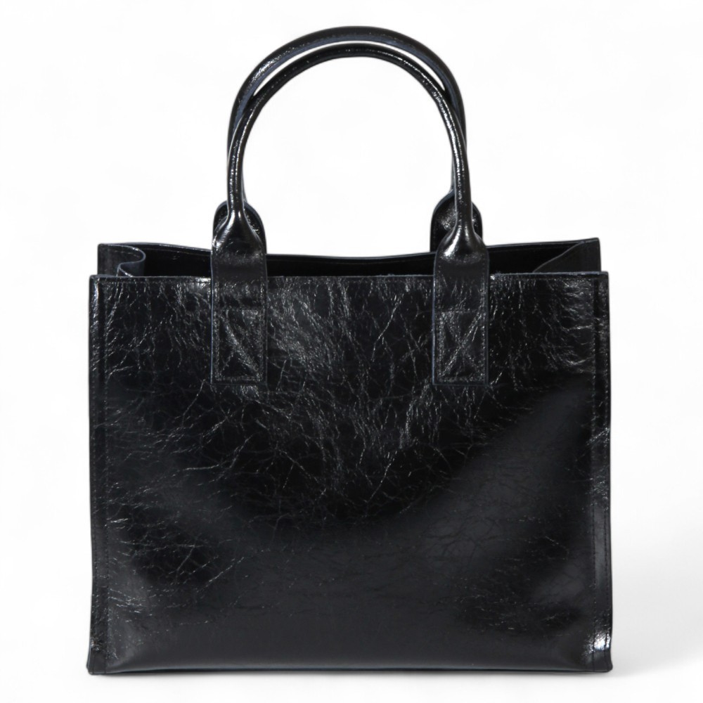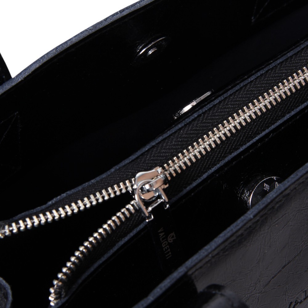 Сумка от бренда Valigetti выполнена из натуральной кожи черного цвета с эффектом помятости. Модель с двумя ручками. Внутри: фирменная текстильная подкладка, карман и накладной карман на молнии.