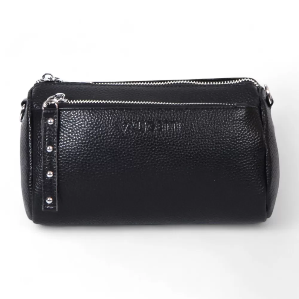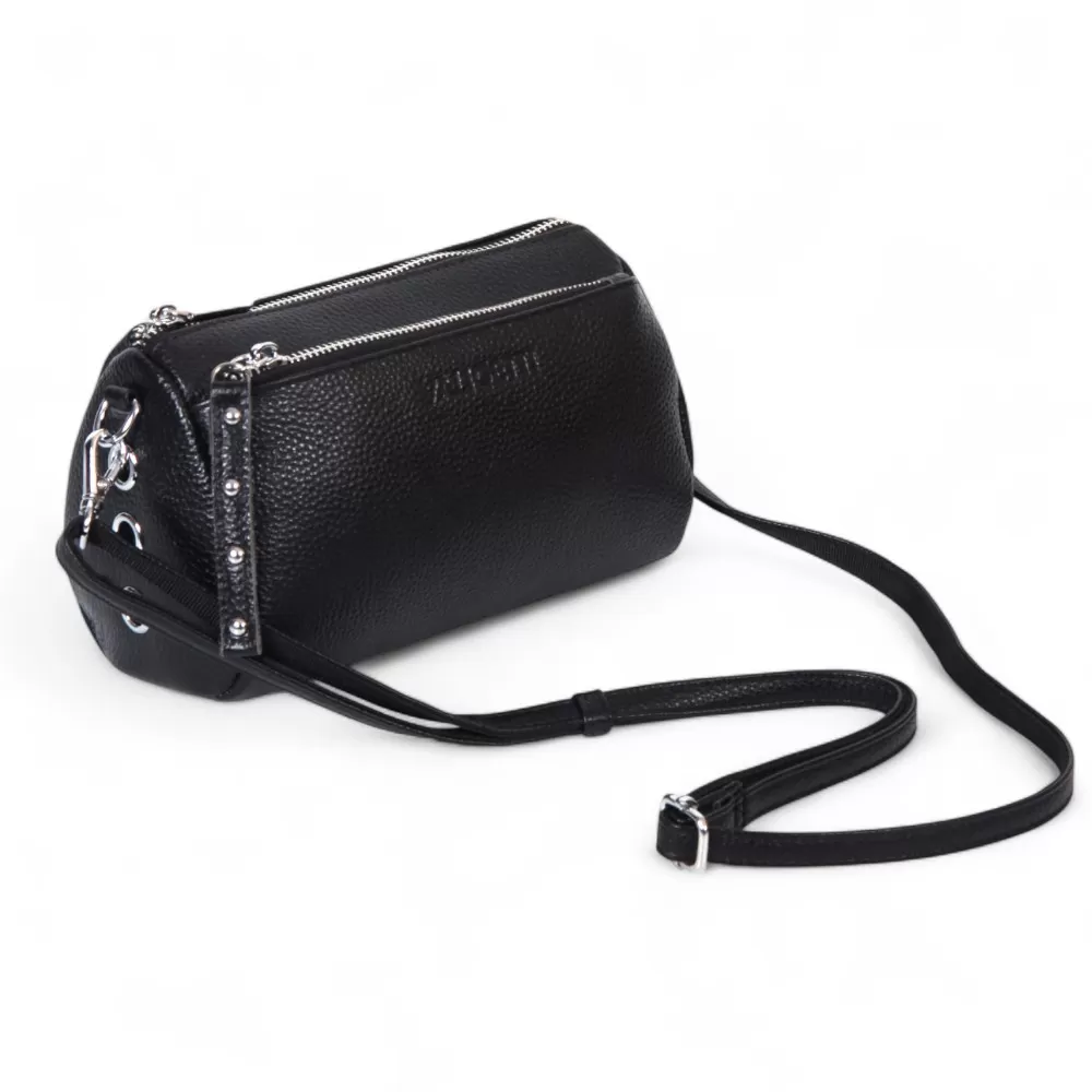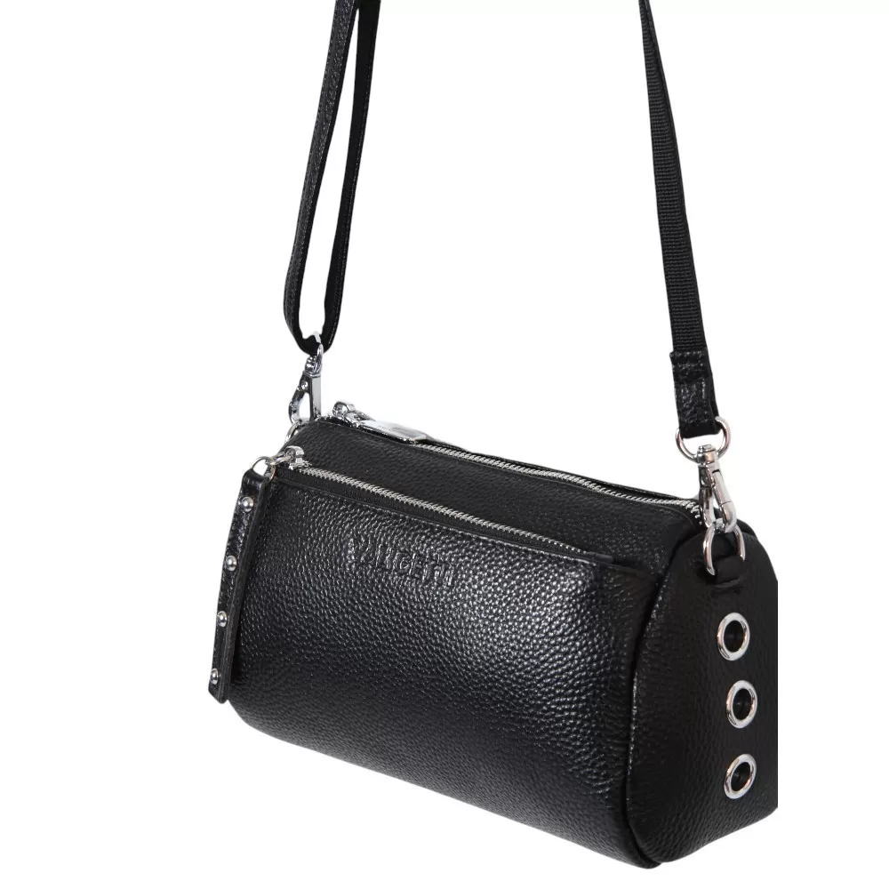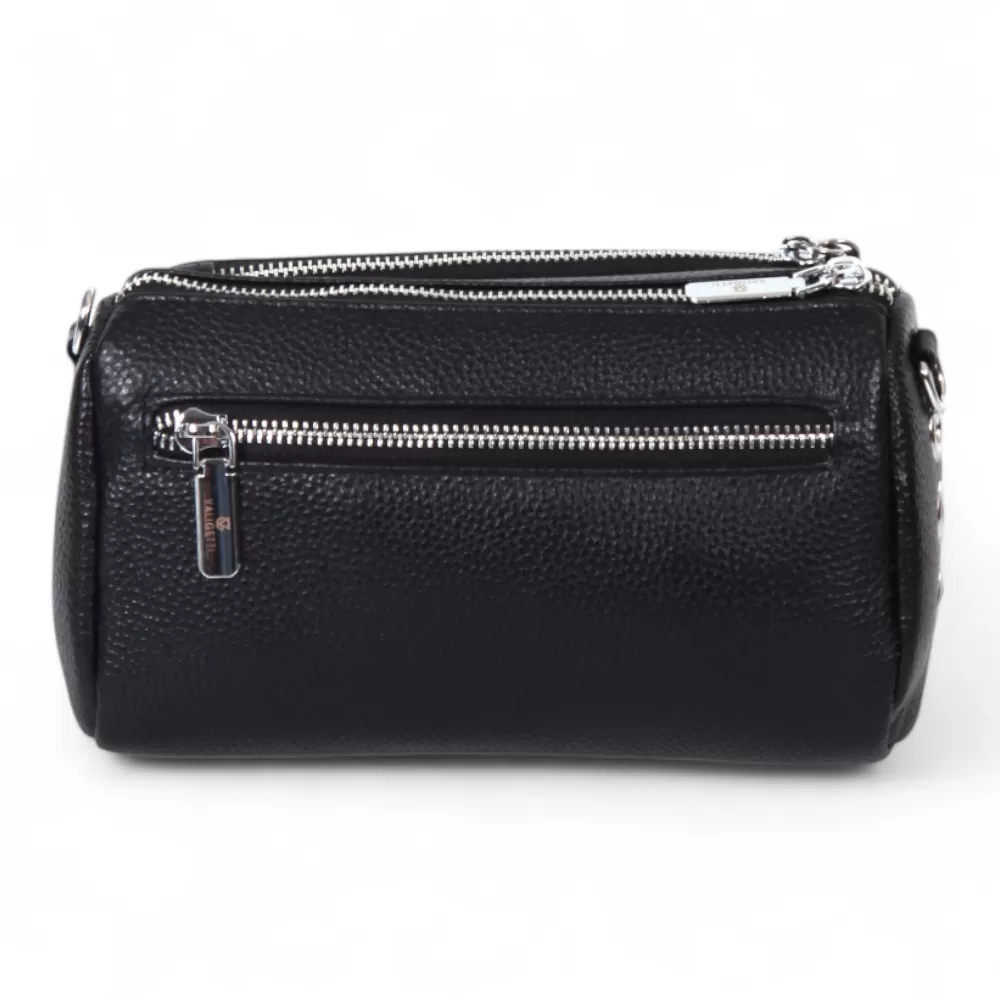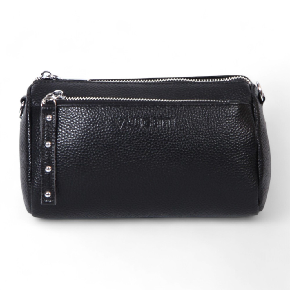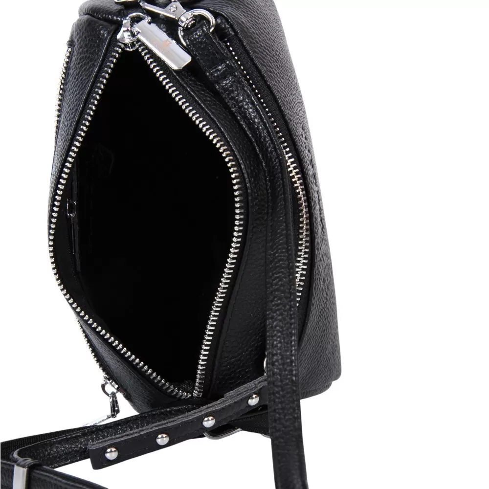 Сумка кросс-боди от бренда Valigetti из натуральной зернистой кожи черного цвета. Компактная модель со съемным регулируемым плечевым ремнем. Отделение на молнии. Внутри: фирменная подкладка, карман на молнии, накладной карман. На лицевой стороне — карман на молнии с оригинальным пуллером с заклепками. На задней стороне — карман на молнии. По бокам — декоративные люверсы.