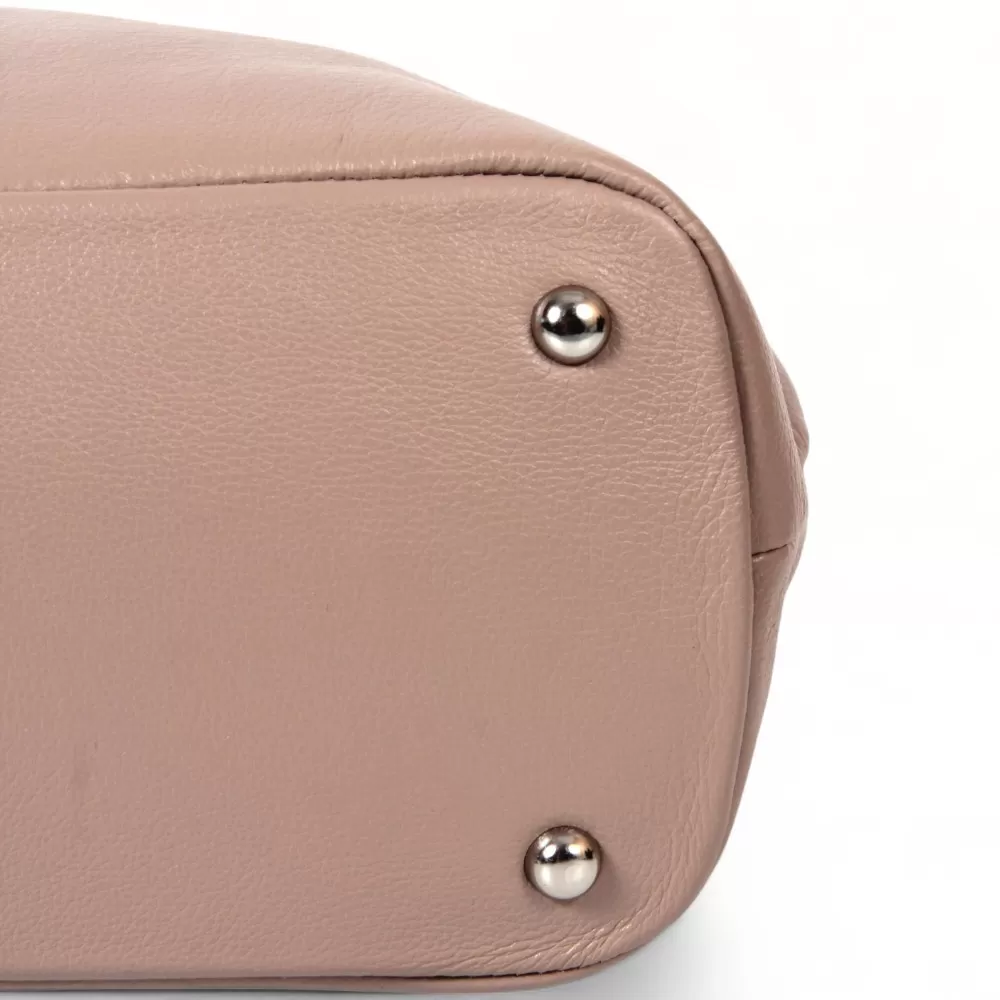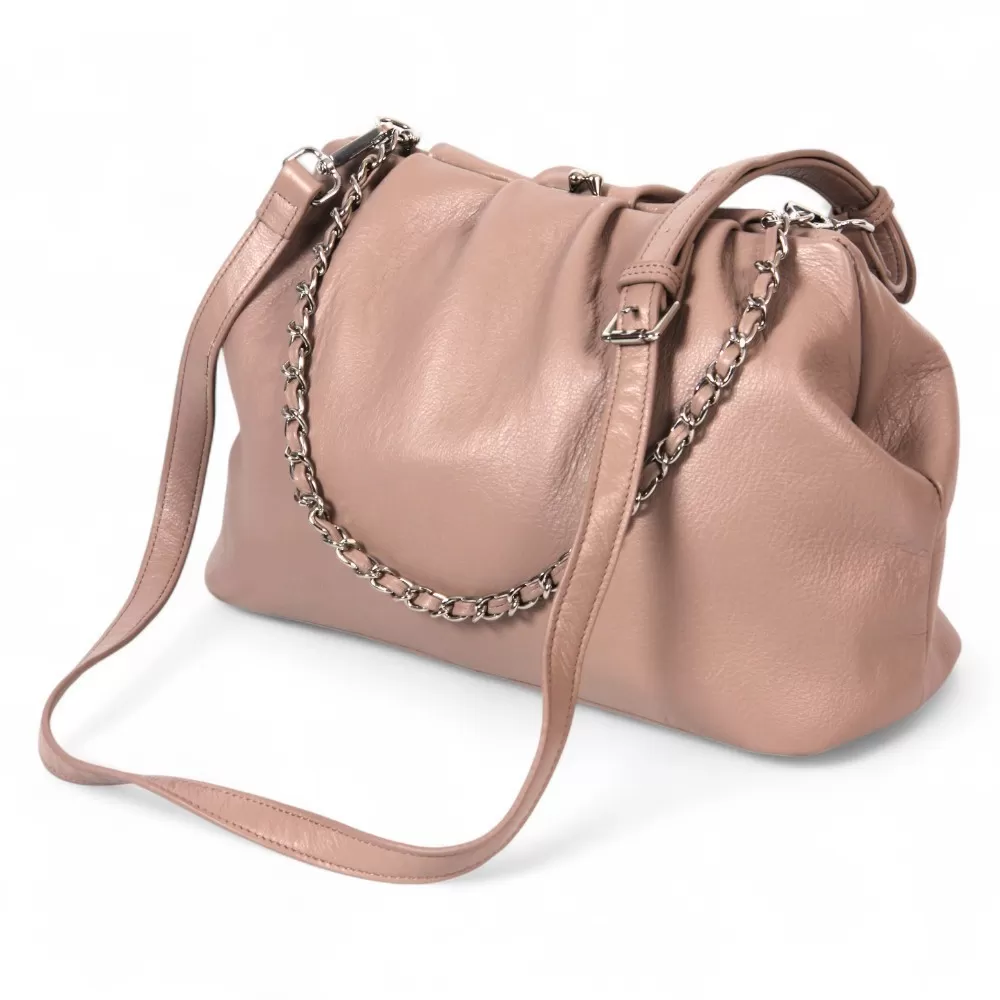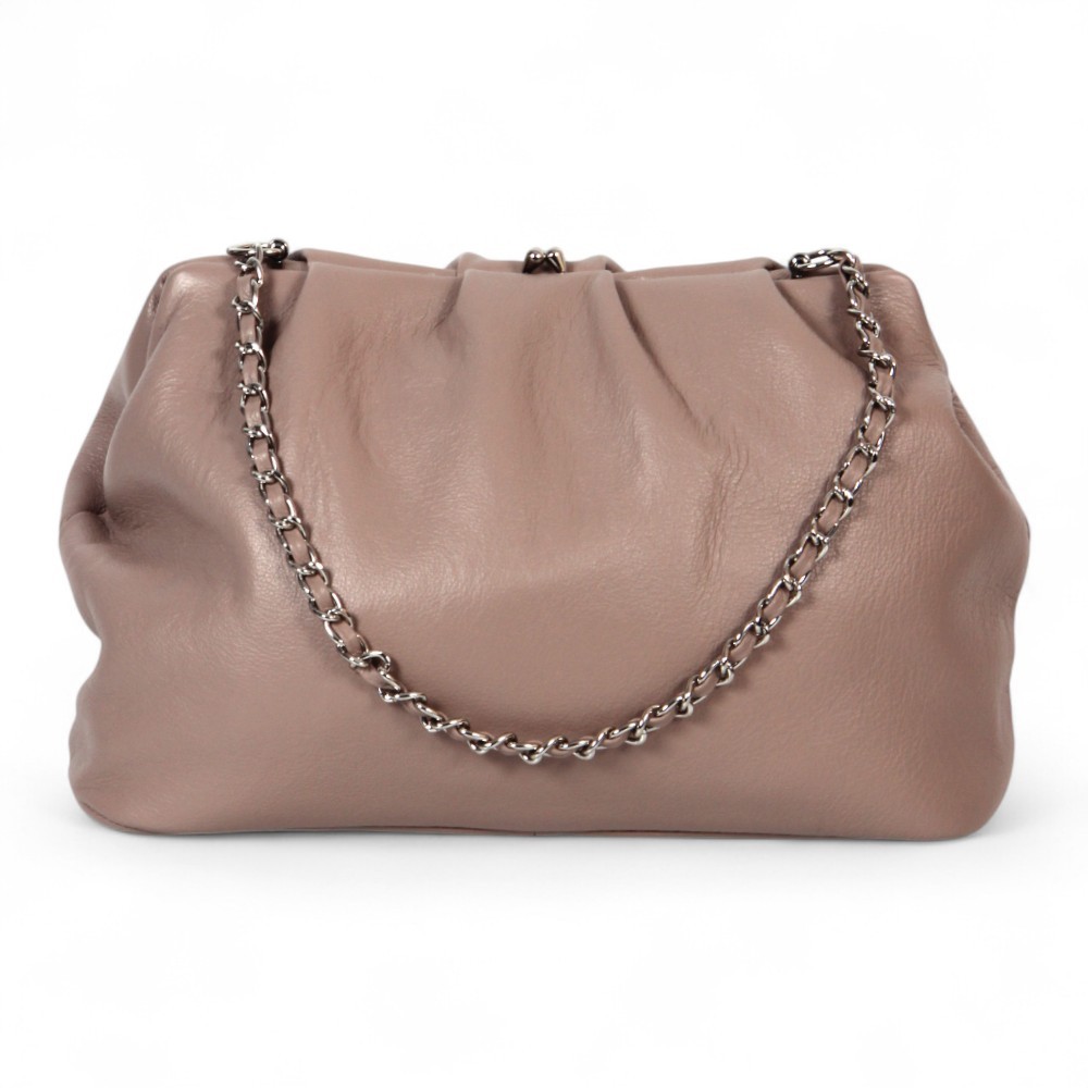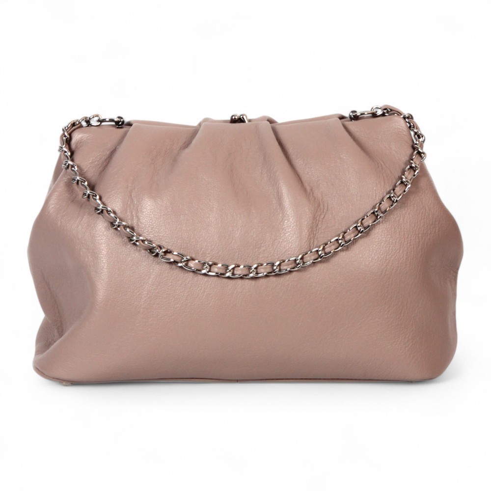 Сумка от бренда Poshete из натуральной кожи бежевого цвета. Модель с ручкой-цепочкой и съемным регулируемым плечевым ремнем. Имеет рамочный тип закрытия – фермуар. В отделении: фирменная подкладка, карман на молнии, перегородка, образующая накладной карман. На задней стороне – карман на молнии.