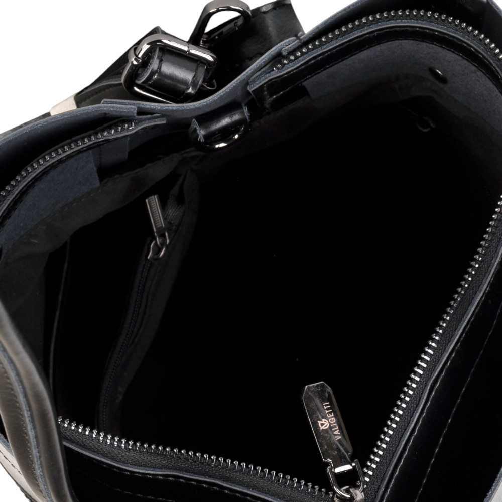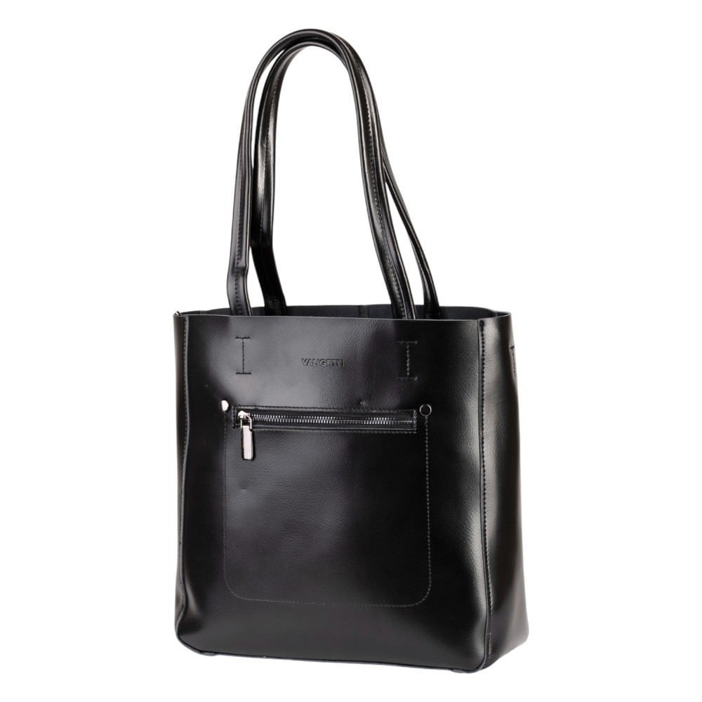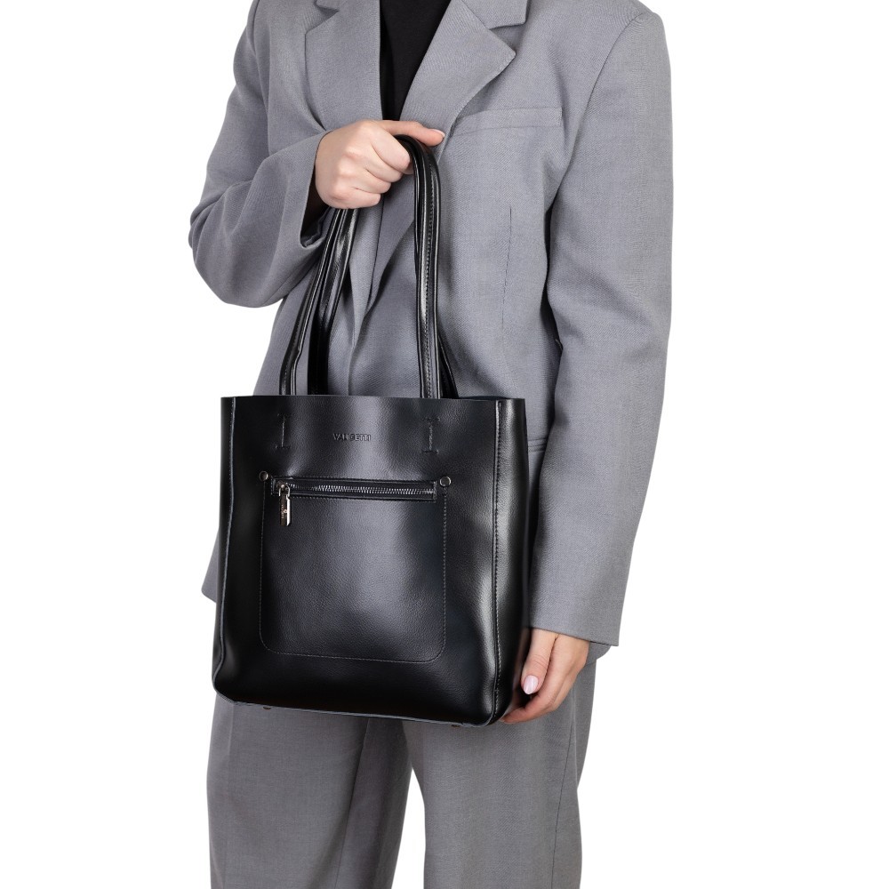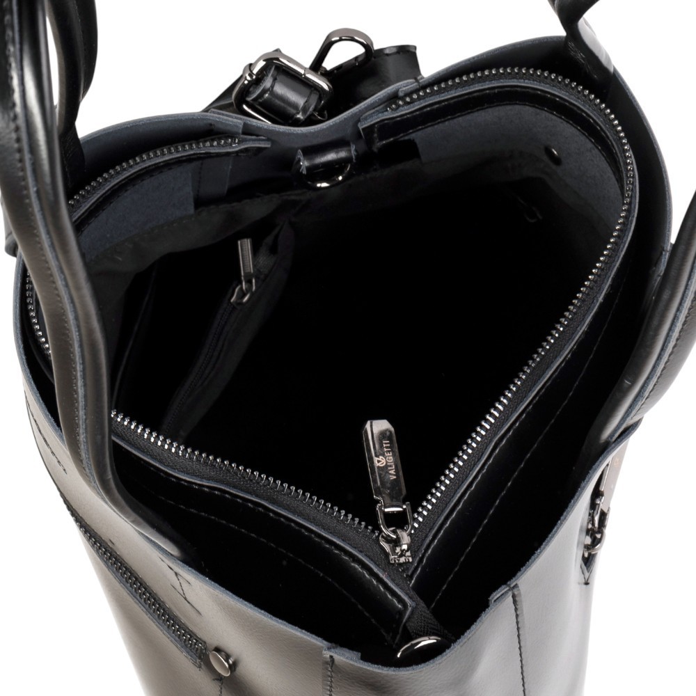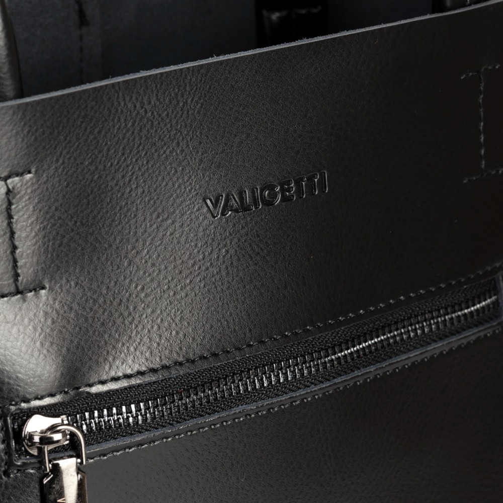 Сумка от бренда Valigetti из натуральной гладкой кожи черного цвета. Модель шоппер с двумя удлиненными ручками и съемным плечевым ремнем. Отделение на молнии. Внутри: фирменная подкладка, средник и карман на молнии, два накладных кармана. На лицевой и задней сторонах – карман на молнии. Дно оснащено ножками для защиты от износа.