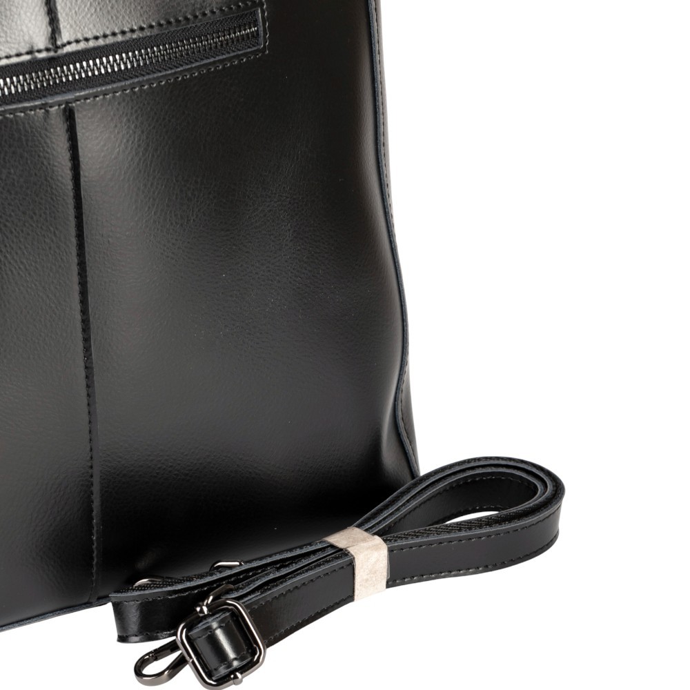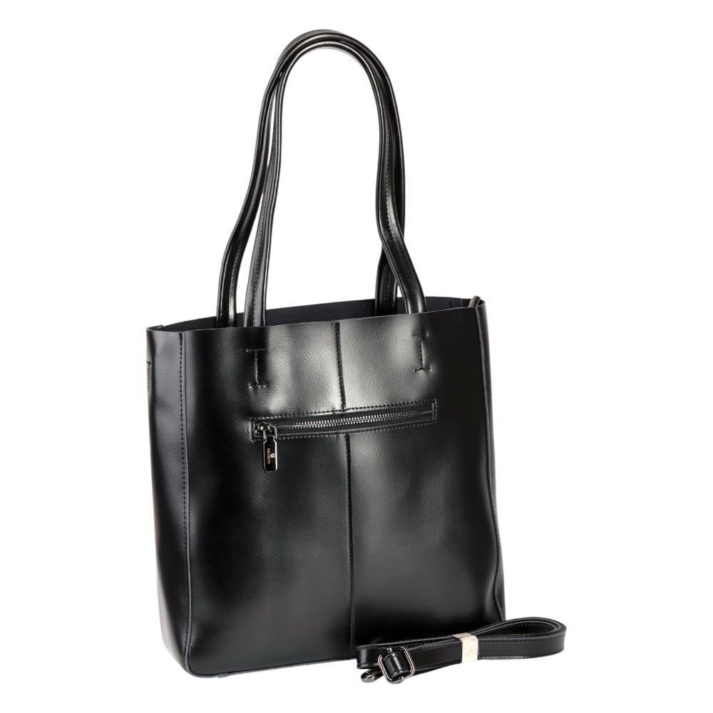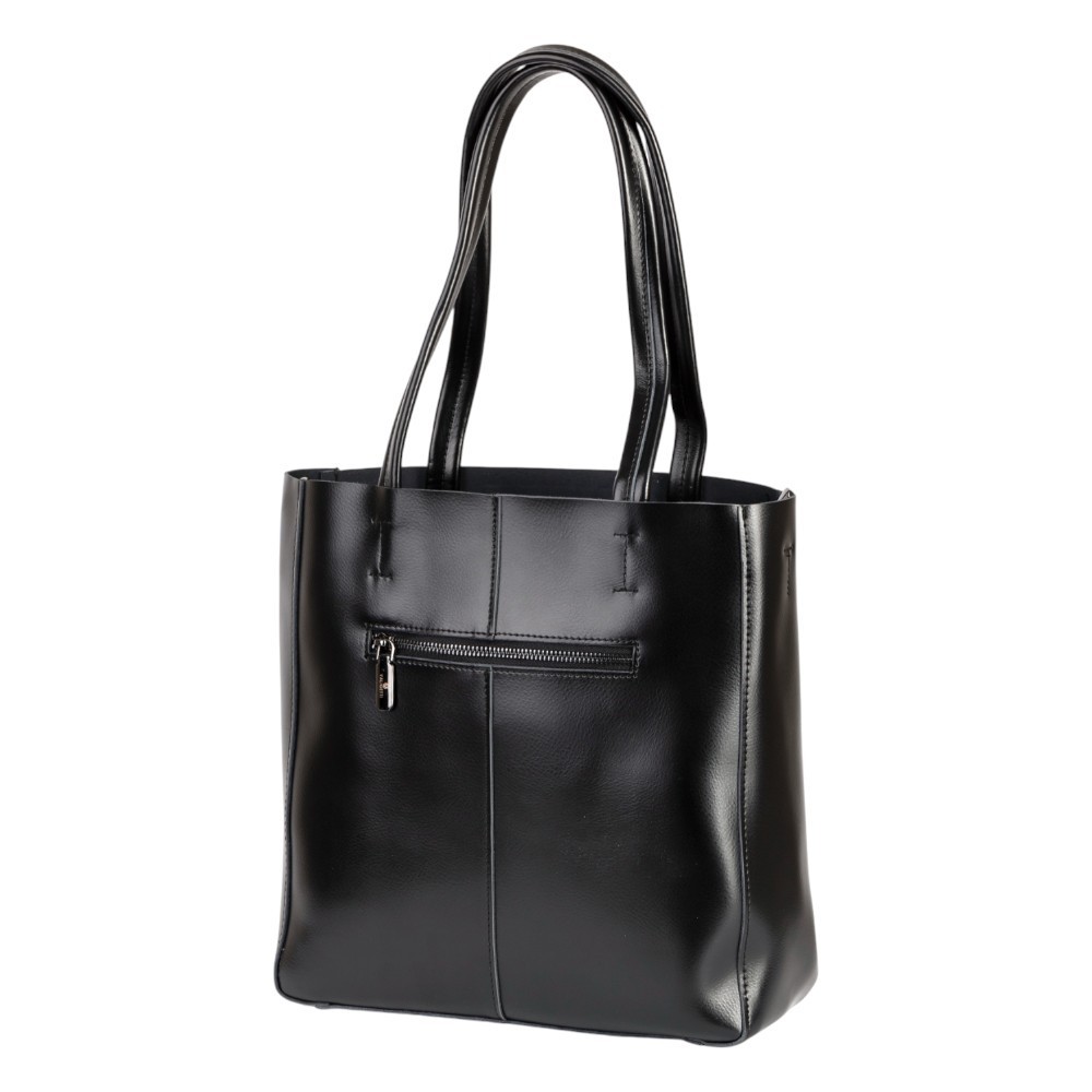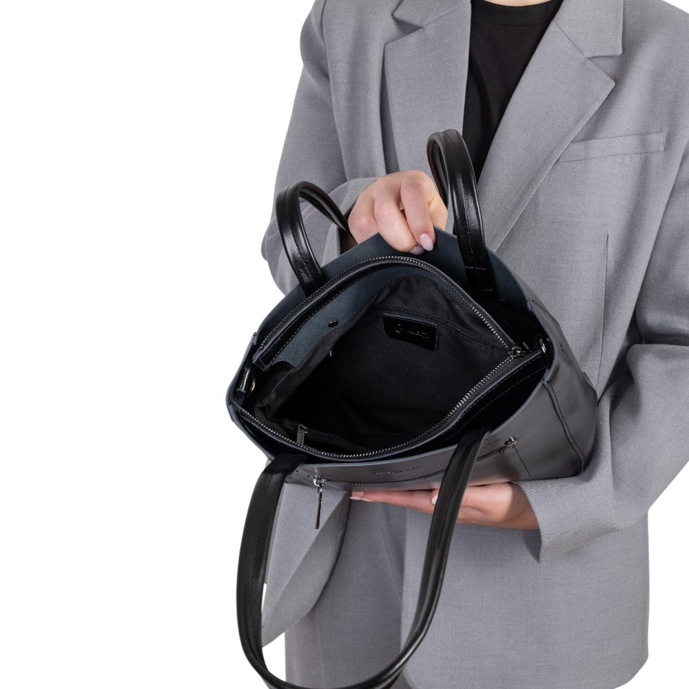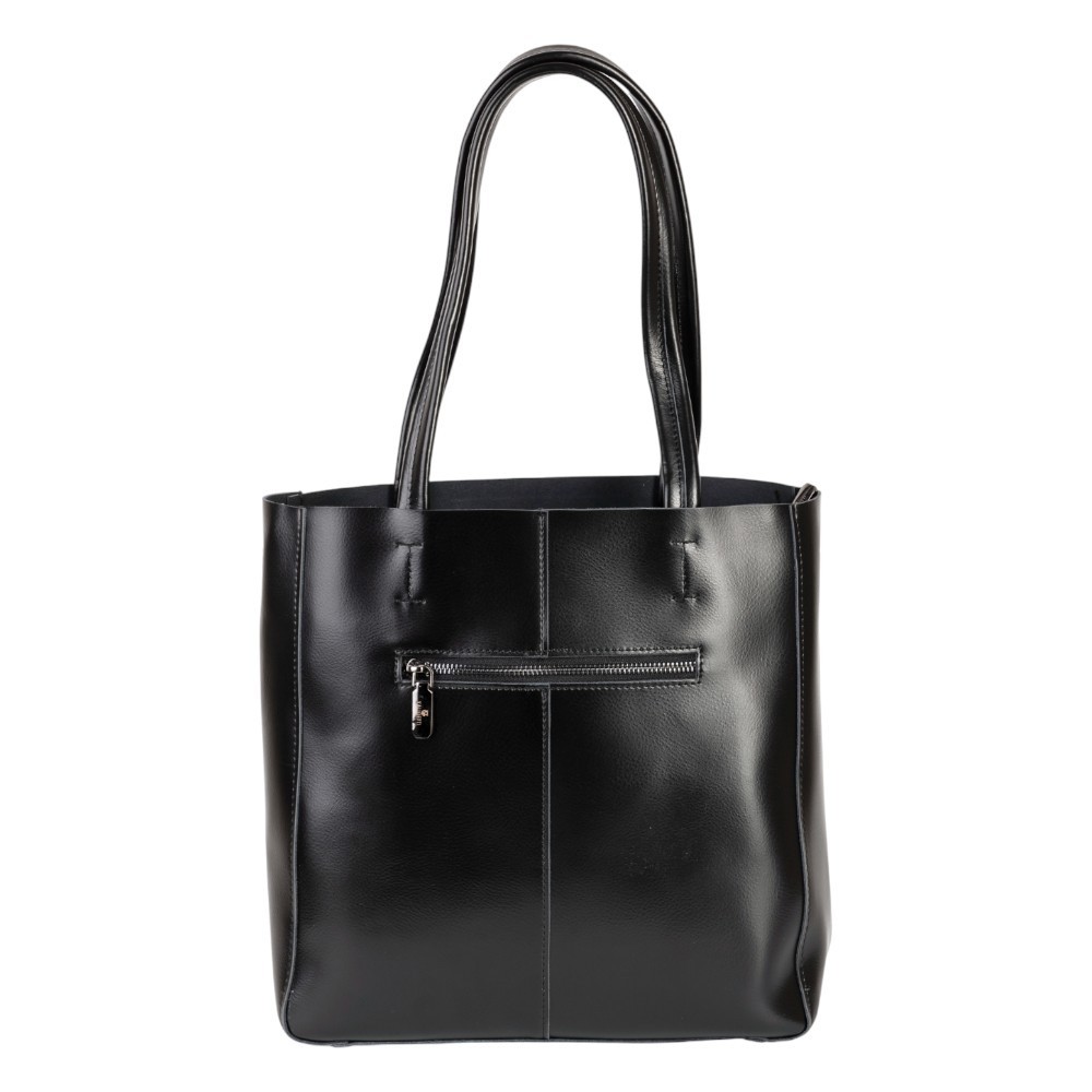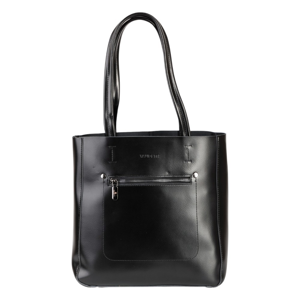 Сумка от бренда Valigetti из натуральной гладкой кожи черного цвета. Модель шоппер с двумя удлиненными ручками и съемным плечевым ремнем. Отделение на молнии. Внутри: фирменная подкладка, средник и карман на молнии, два накладных кармана. На лицевой и задней сторонах – карман на молнии. Дно оснащено ножками для защиты от износа.