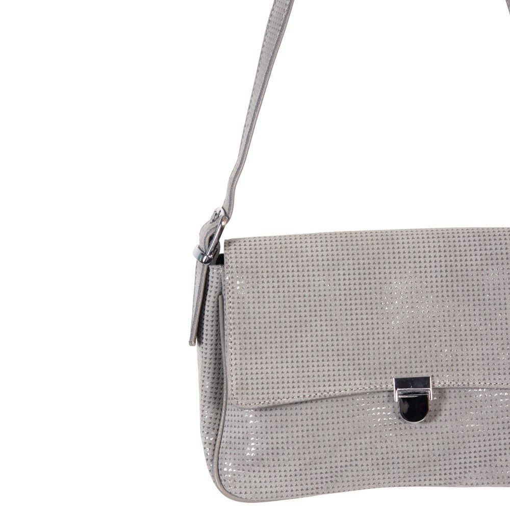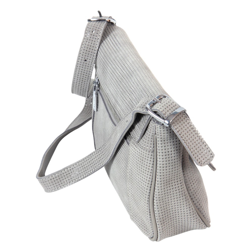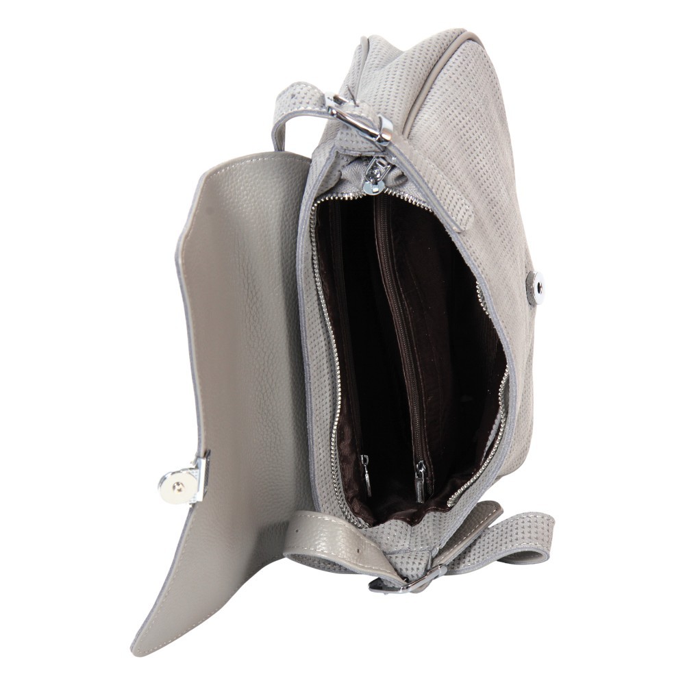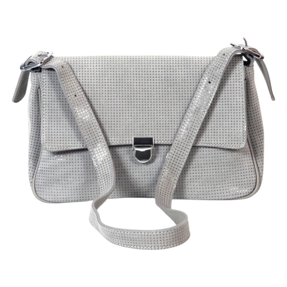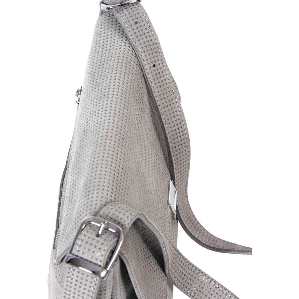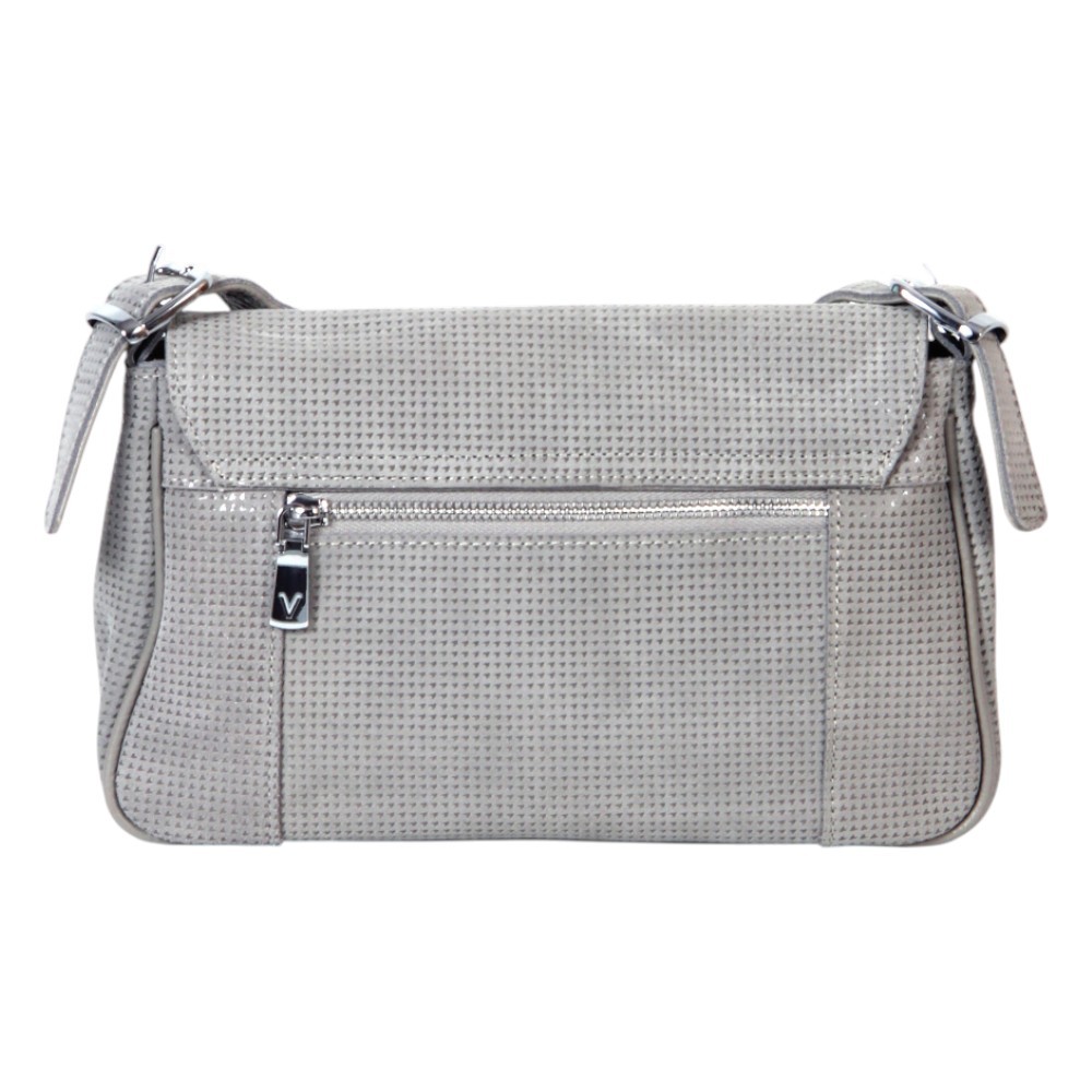 Сумка от бренда Valigetti выполнена из натуральной кожи в сером цвете. Модель с несъемным регулируемым плечевым ремнем, закрывается клапаном на магнитной кнопке, основное отделение на молнии, внутри: текстильная фирменная подкладка, накладной карман на молнии и открытый карман на молнии. На задней стороне расположен горизонтальный карман быстрого доступа на молнии.