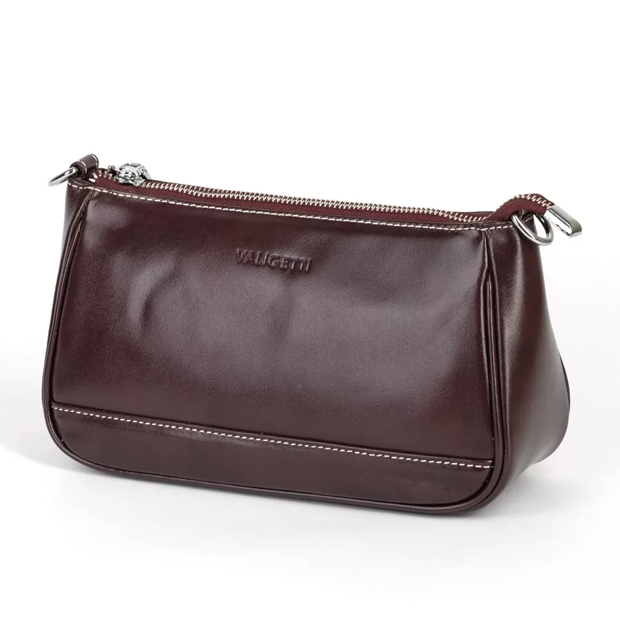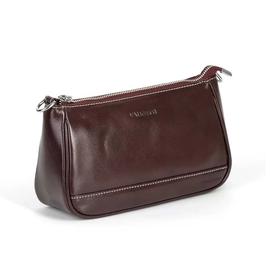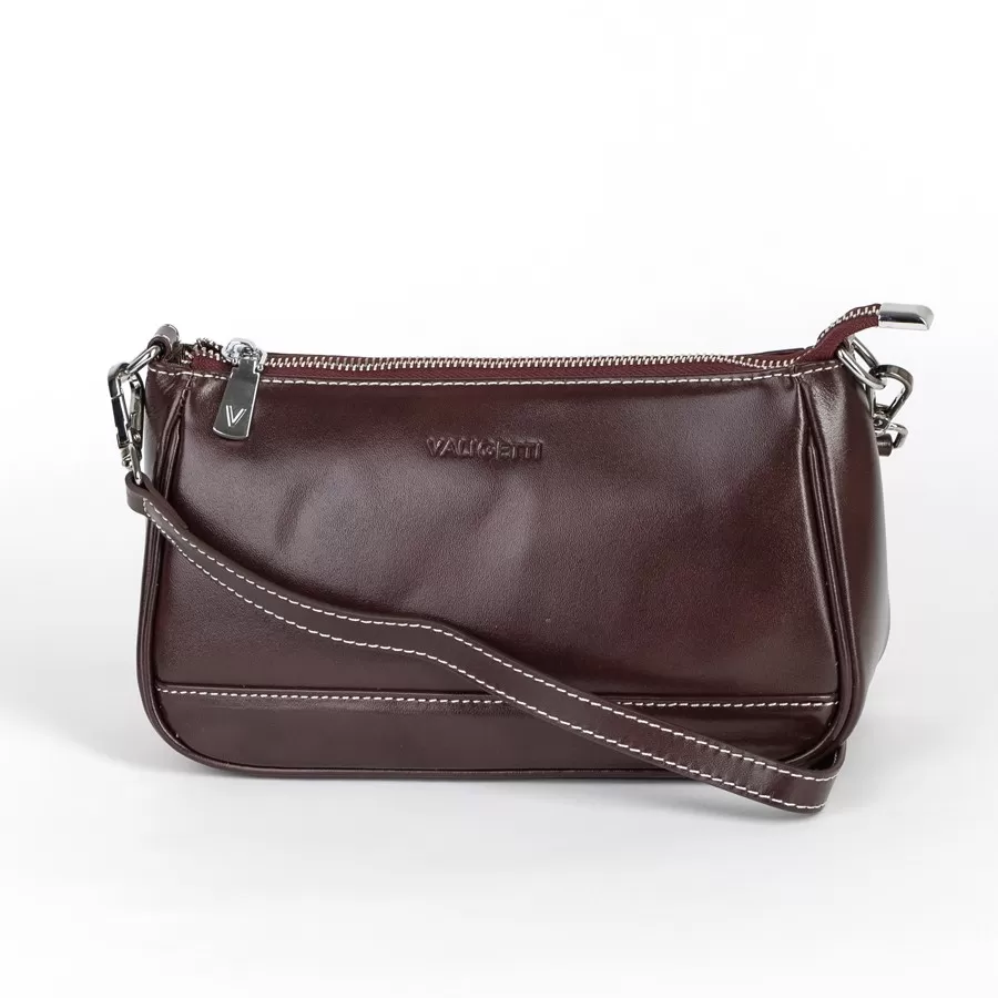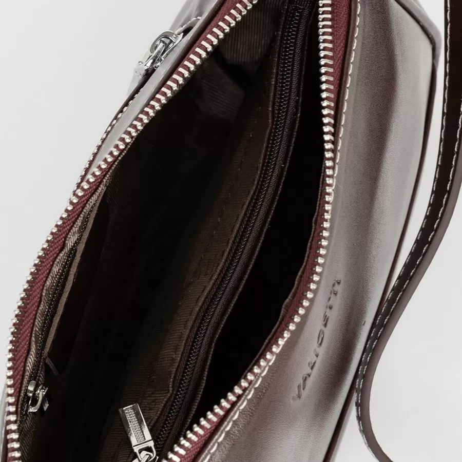 Сумка от торговой марки Valigetti из гладкой натуральной кожи бордового цвета. Модель с ручкой и съемным регулируемым плечевым ремнем. 1 основное отделение. Внутри средник на молнии, делящий сумку на 2 отделения, а также открытый карман и кармашек на молнии. На внешней стороне есть карман на молнии