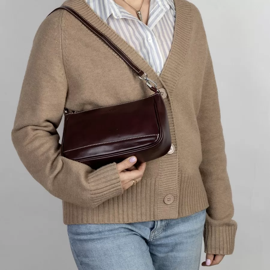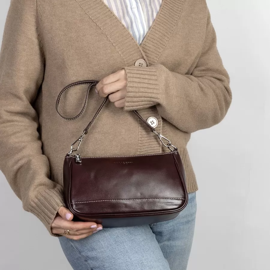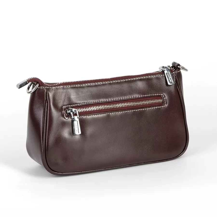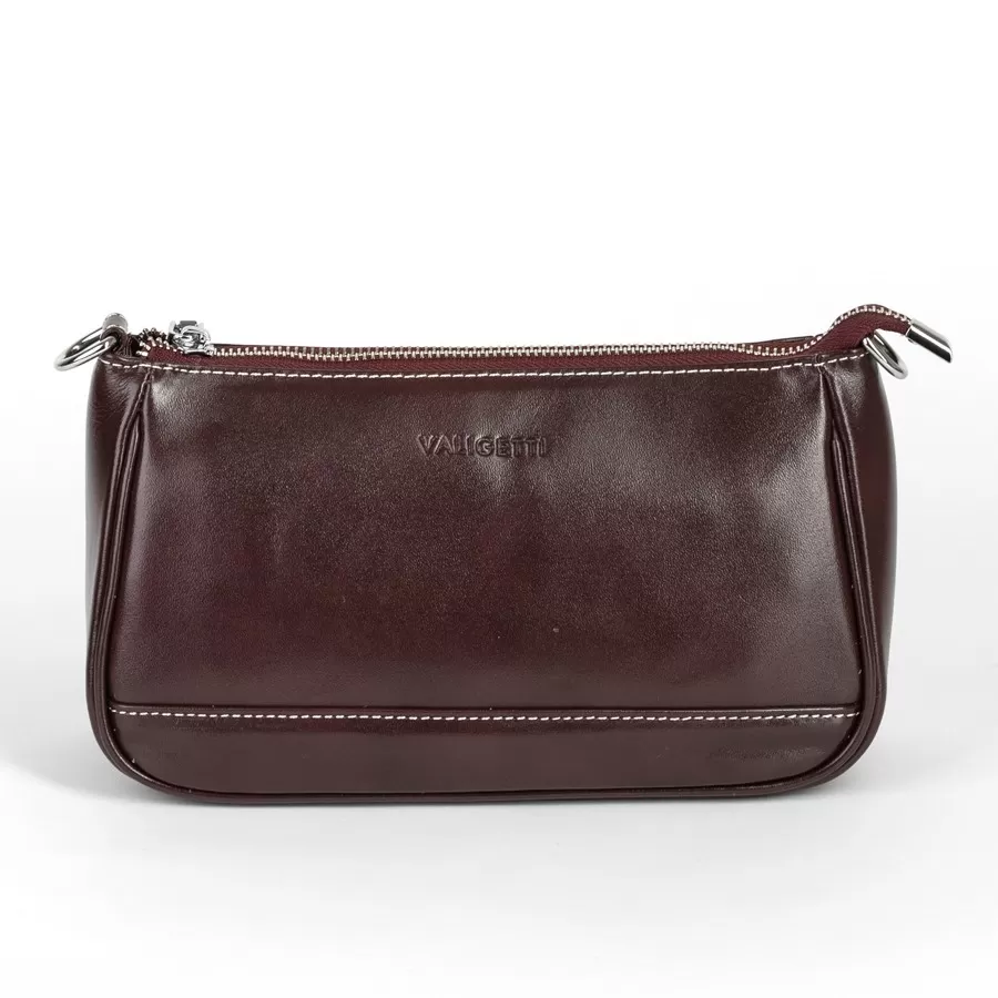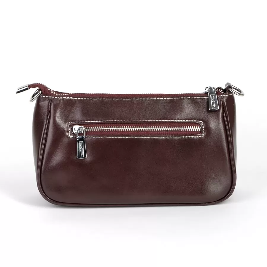 Сумка от торговой марки Valigetti из гладкой натуральной кожи бордового цвета. Модель с ручкой и съемным регулируемым плечевым ремнем. 1 основное отделение. Внутри средник на молнии, делящий сумку на 2 отделения, а также открытый карман и кармашек на молнии. На внешней стороне есть карман на молнии