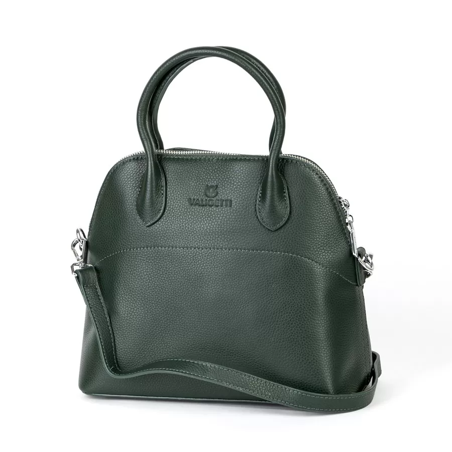 Элегантный женская сумка бренда Valigetti из натуральной кожи цвета темный изумруд с зернистой структурой. Прошит фирменной подкладочной тканью. Имеет пришитую кожаные ручки. Внутри 2 отделения под молнией, средник на молнии, 2 кармана на молнии и кармашек для мелких вещей. На задней стороны есть карман на молнии