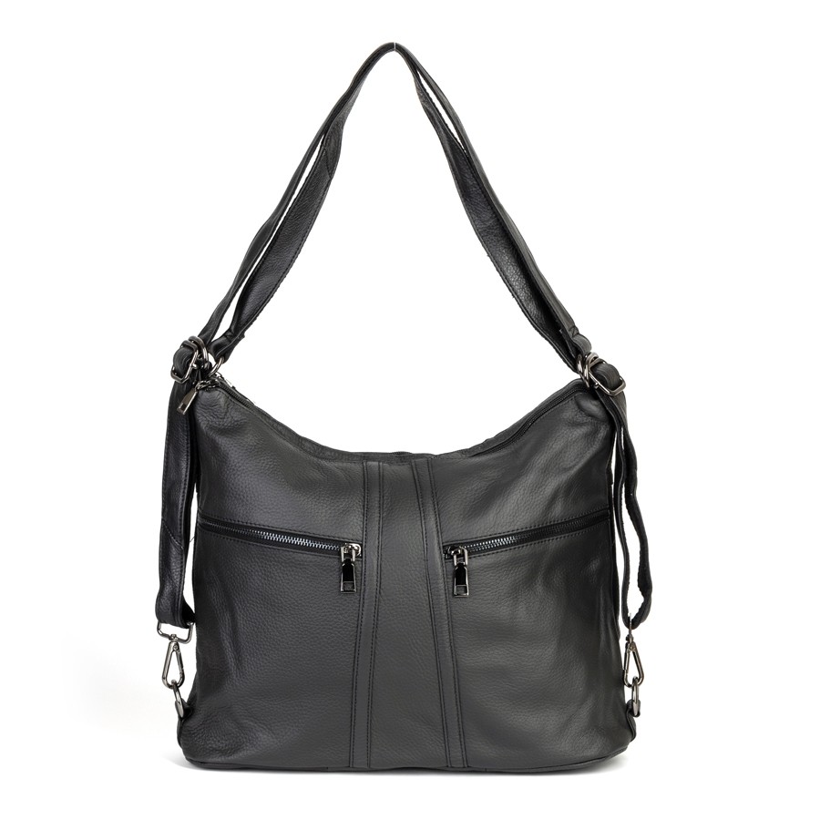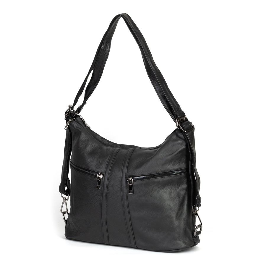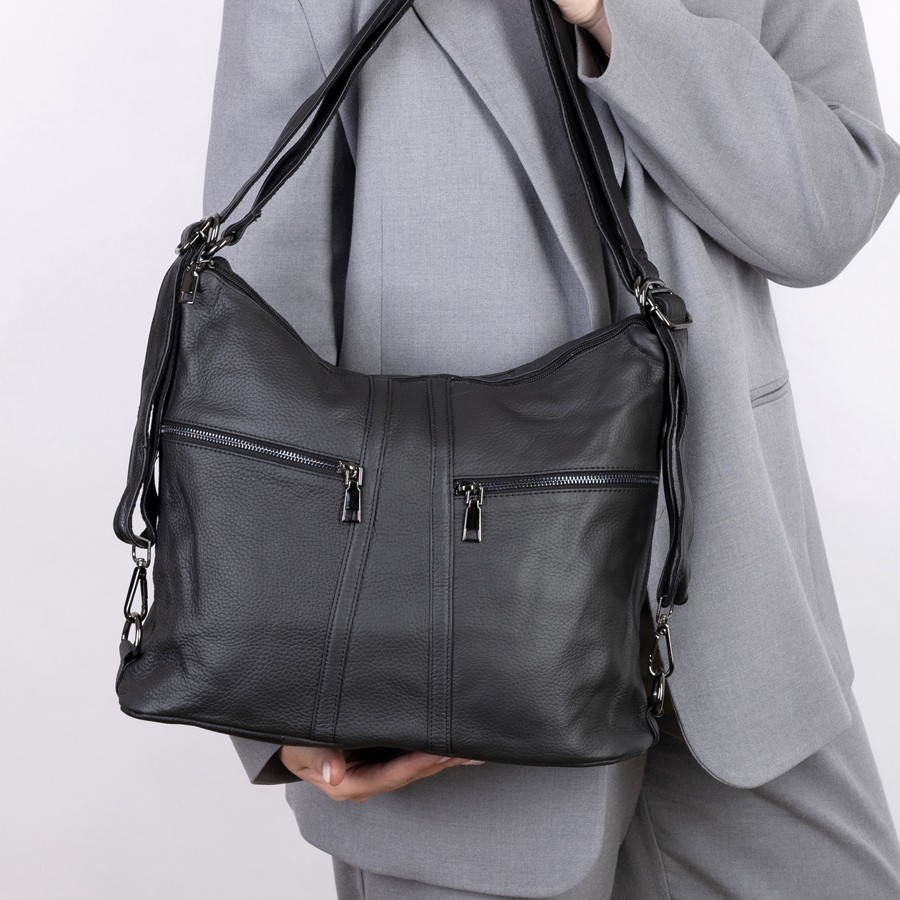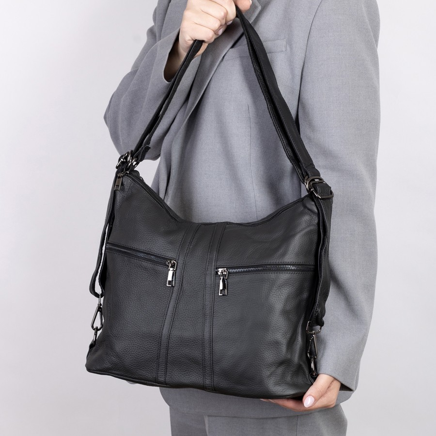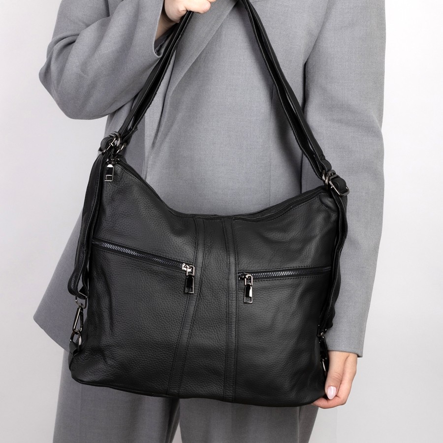 Сумка-рюкзак от торговой марки Poshete из натуральной кожи черного цвета. Модель с двумя ручками, которые стягиваются в регулируемые плечевые лямки. Отделение на молнии. Внутри: подкладка, средник и карман на молнии, два накладных кармана. На лицевой стороне – два кармана на молнии. На задней стороне – карман на молнии.