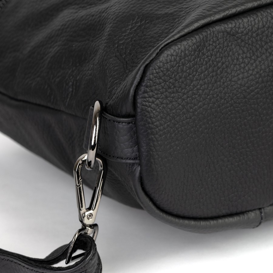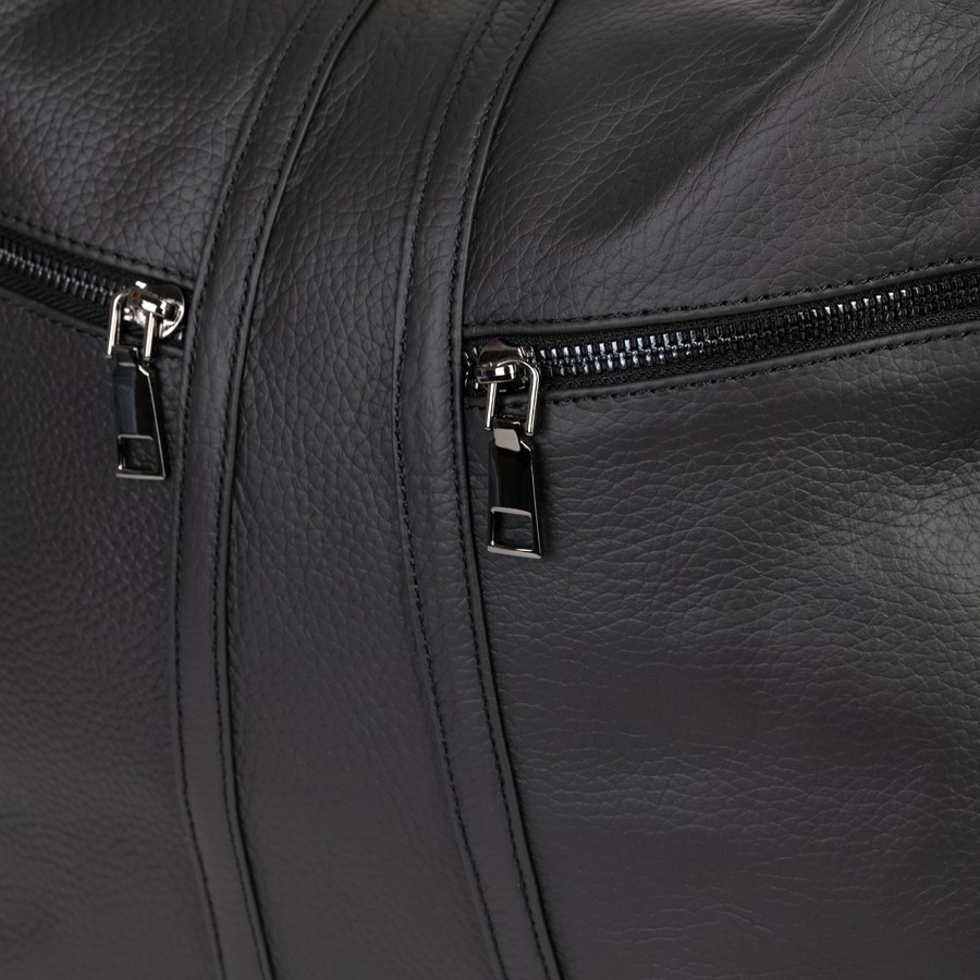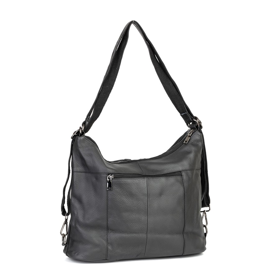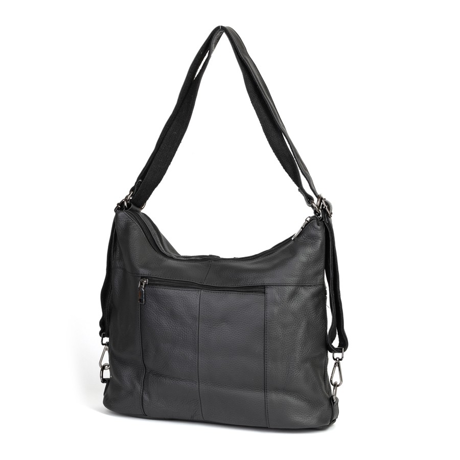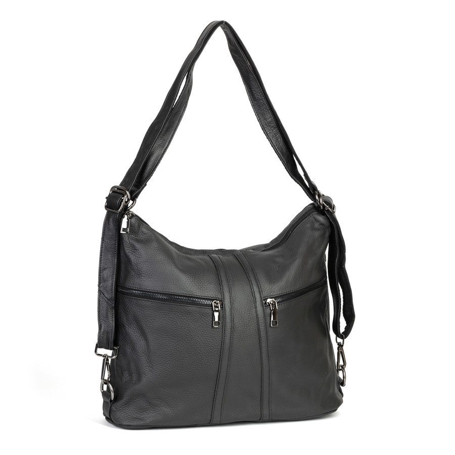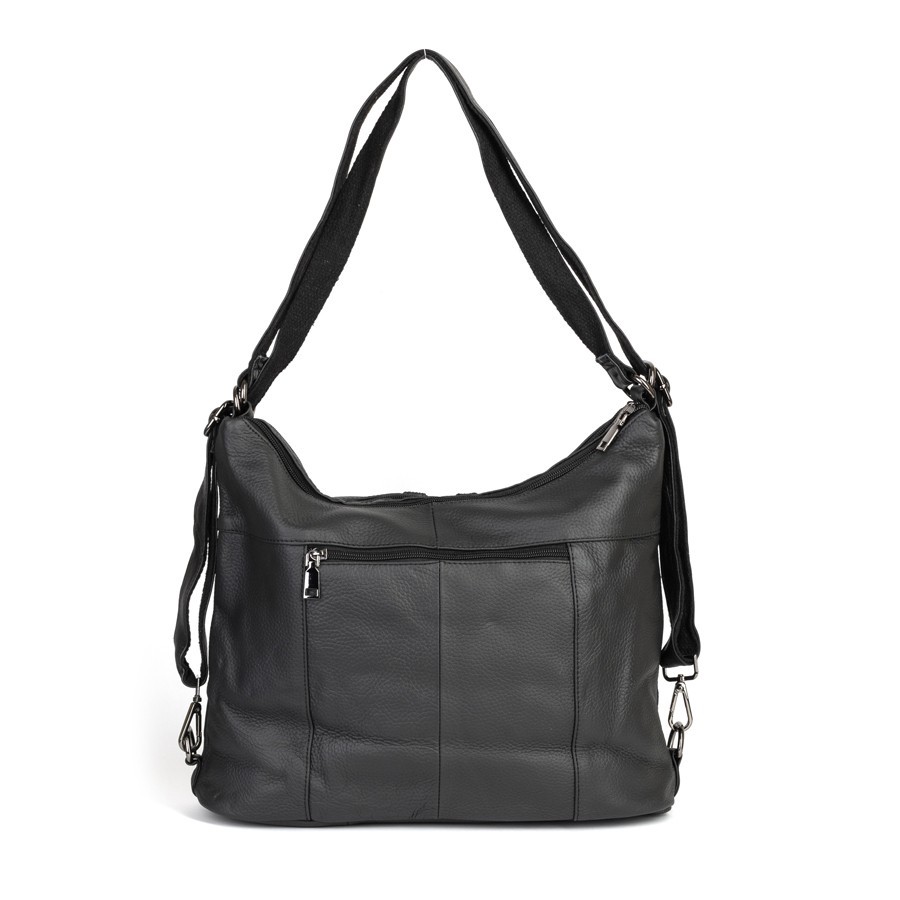 Сумка-рюкзак от торговой марки Poshete из натуральной кожи черного цвета. Модель с двумя ручками, которые стягиваются в регулируемые плечевые лямки. Отделение на молнии. Внутри: подкладка, средник и карман на молнии, два накладных кармана. На лицевой стороне – два кармана на молнии. На задней стороне – карман на молнии.