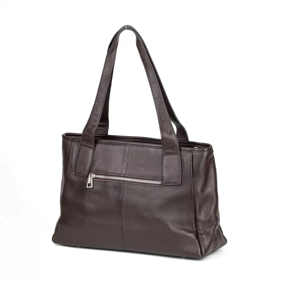 Женская сумка бренда Valigetti из натуральной кожи с зернистой структурой. Прошита фирменной подкладочной тканью. Имеет вшитые кожаные ручки. Внутри 2 отделения под молнией, средник на молнии, 2 кармана на молнии и кармашек для мелких вещей. На задней стороне есть карман на молнии