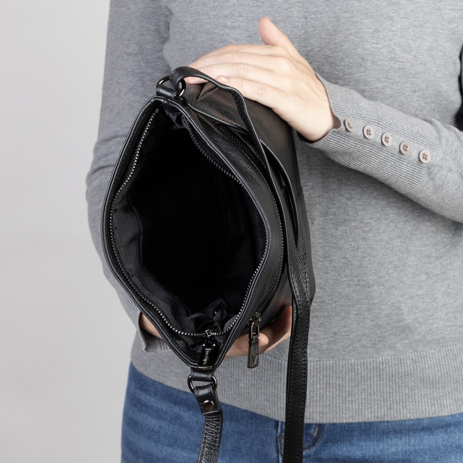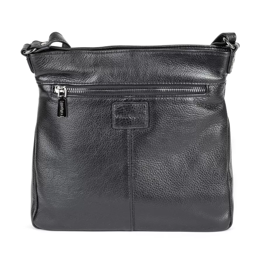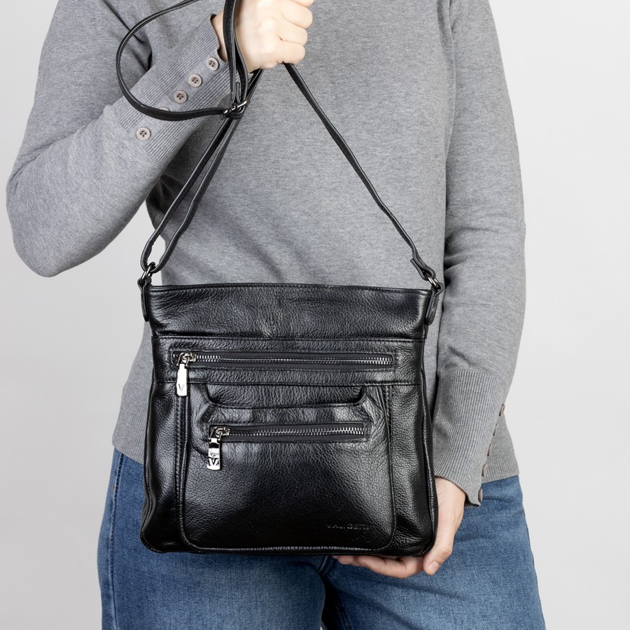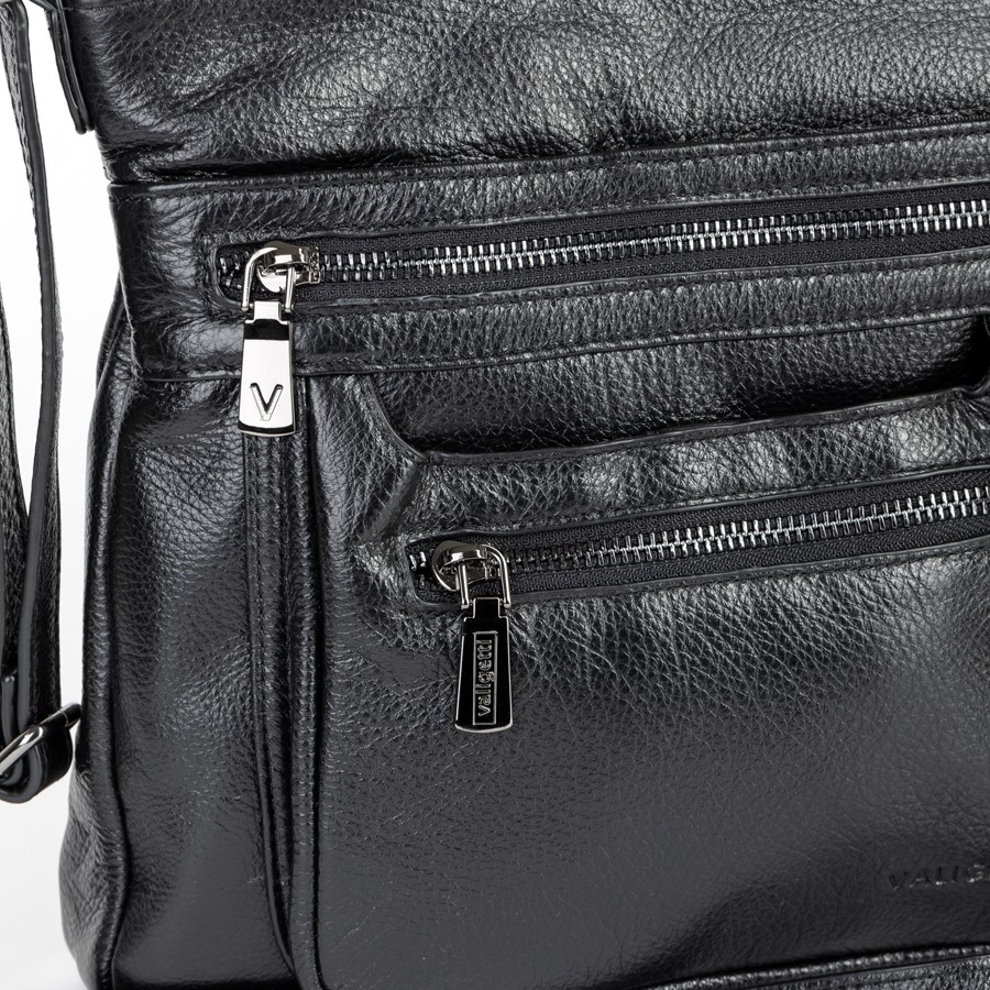 Женская сумка‑шоппер из чёрной кожи с текстурированной поверхностью. Форма — прямоугольная, с несколькими фронтальными карманами на молнии. Внутри одно отделение и несколько карманов.