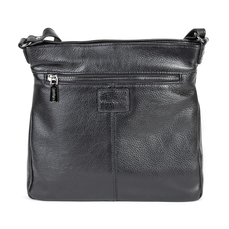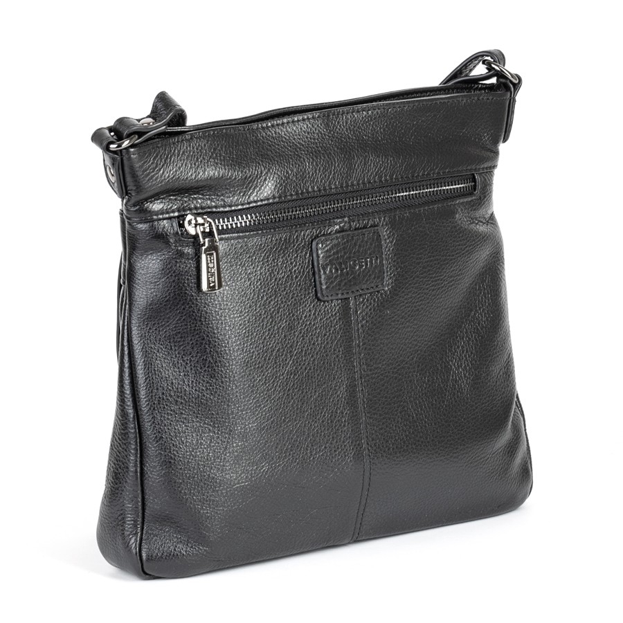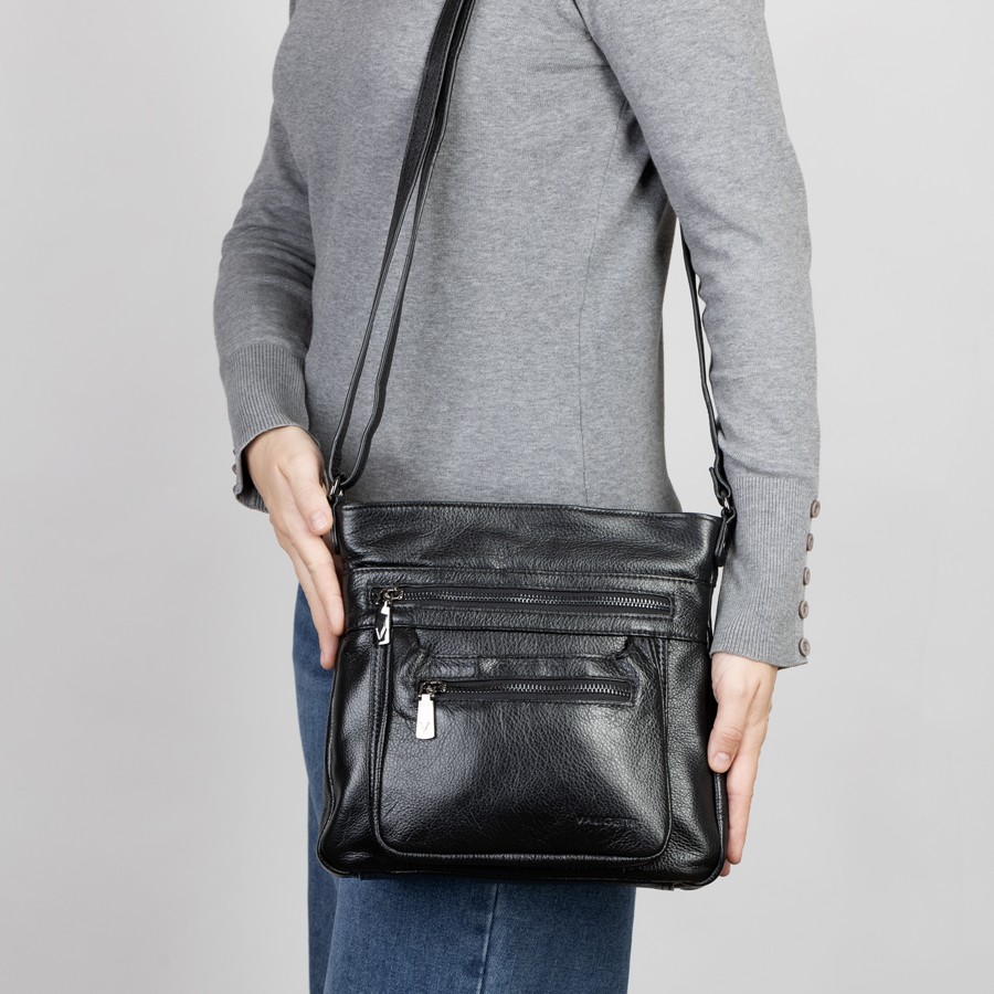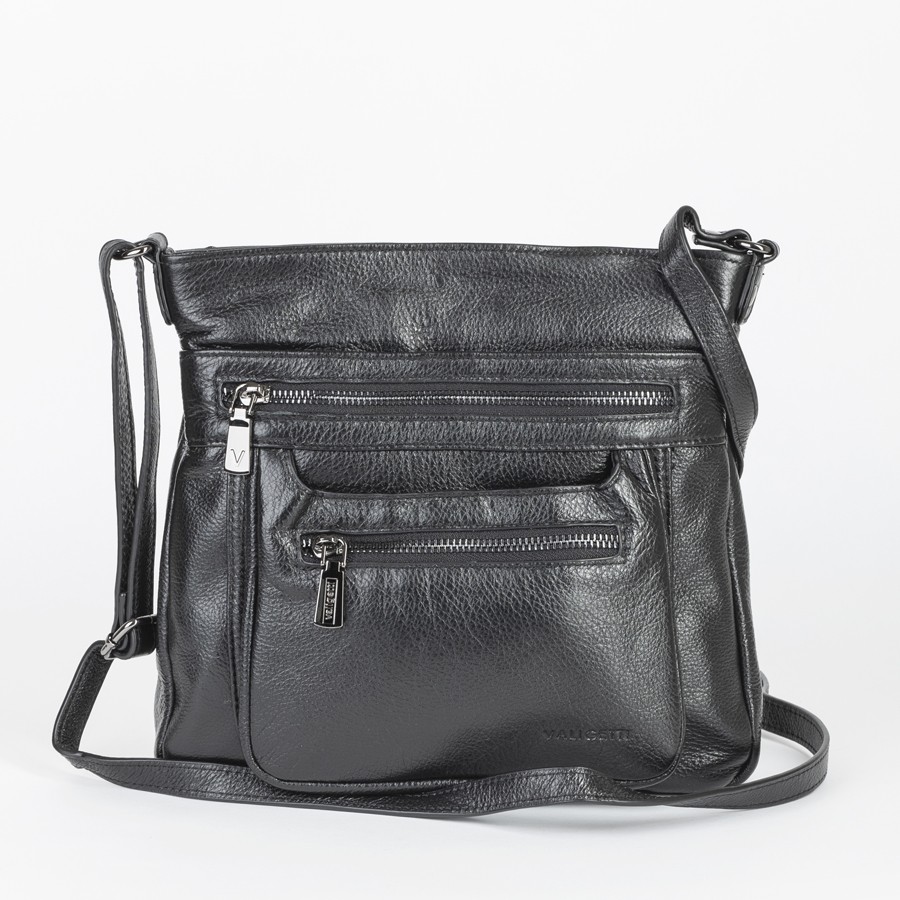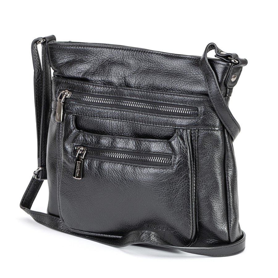 Женская сумка‑шоппер из чёрной кожи с текстурированной поверхностью. Форма — прямоугольная, с несколькими фронтальными карманами на молнии. Внутри одно отделение и несколько карманов.