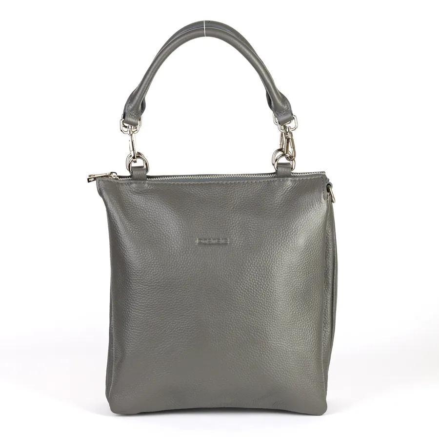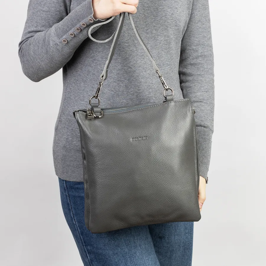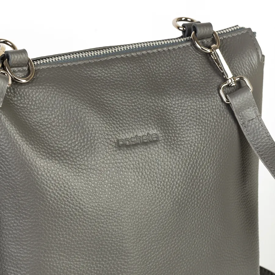Женская сумка бренда Poshete из натуральной кожи с мелкой зернистой структурой. Прошита фирменной подкладочной тканью. Имеет крепления для прицепных длинного плечевого ремня и короткой ручки на карабинах, которые входят в комплект. Внутри под основной молнией 3 отделения: 2 открытых и одно под молнией, карман на молнии и 2 кармашка для мелких вещей. На задней стороне есть карман на молнии