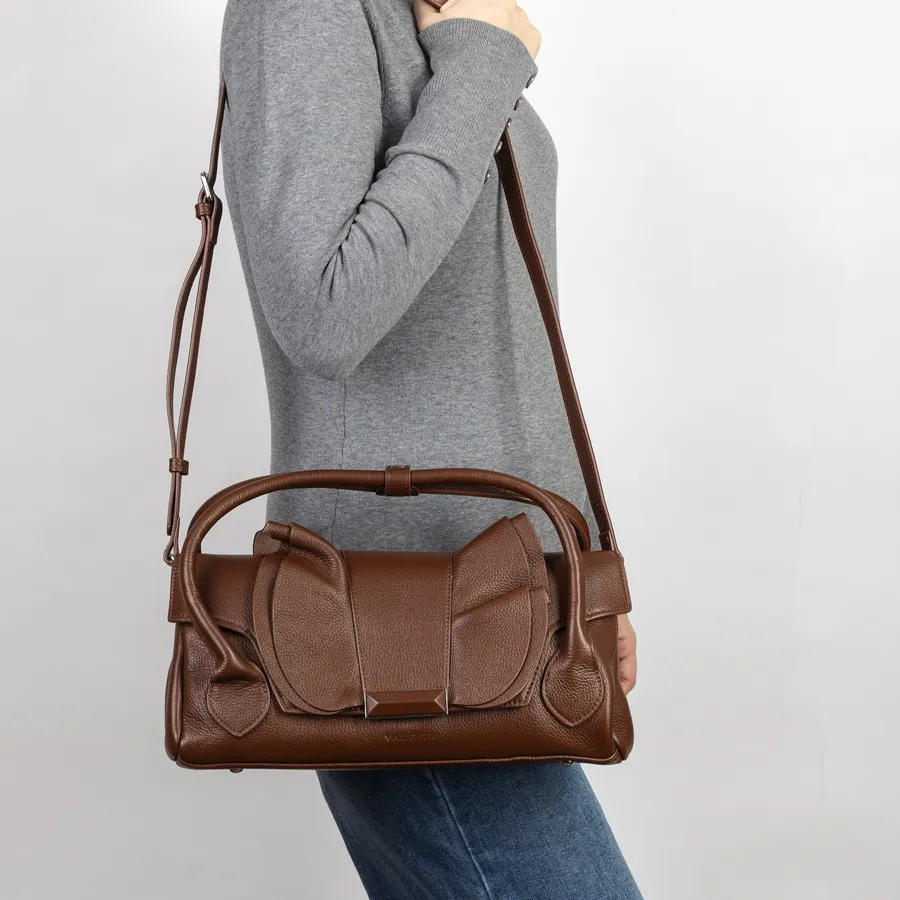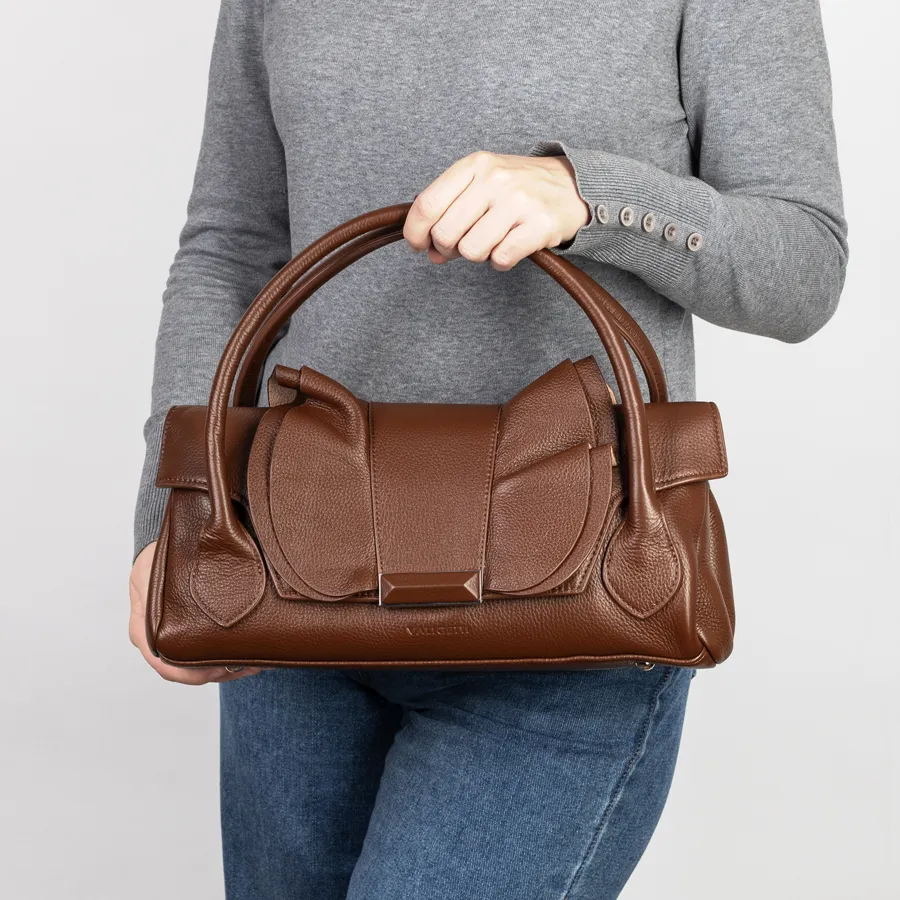 Сумка кросс-боди от торговой марки Valigetti из натуральной зернистой кожи коричнево цвета. Компактная модель, отделение на молнии. Внутри: фирменная подкладка, карман на молнии, накладной карман. На задней стороне – карман на молнии.
