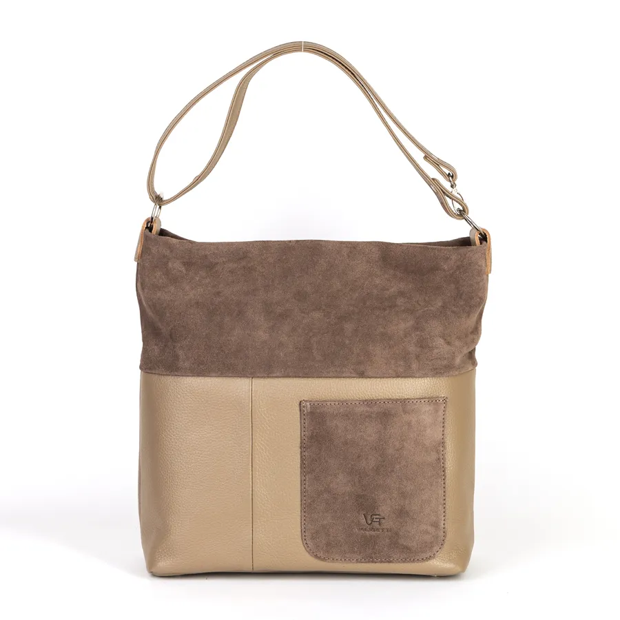 Сумка от торговой марки Valigetti из натуральной кожи светло-серого цвета. Модель с длинной ручкой. Отделение на молнии. Внутри: фирменная подкладка, карман и средник на молнии, накладной карман. С лицевой стороны один накладной карман без застежки. На задней стороне - карман на молнии. Дно оснащено металлическими ножками для защиты от износа.