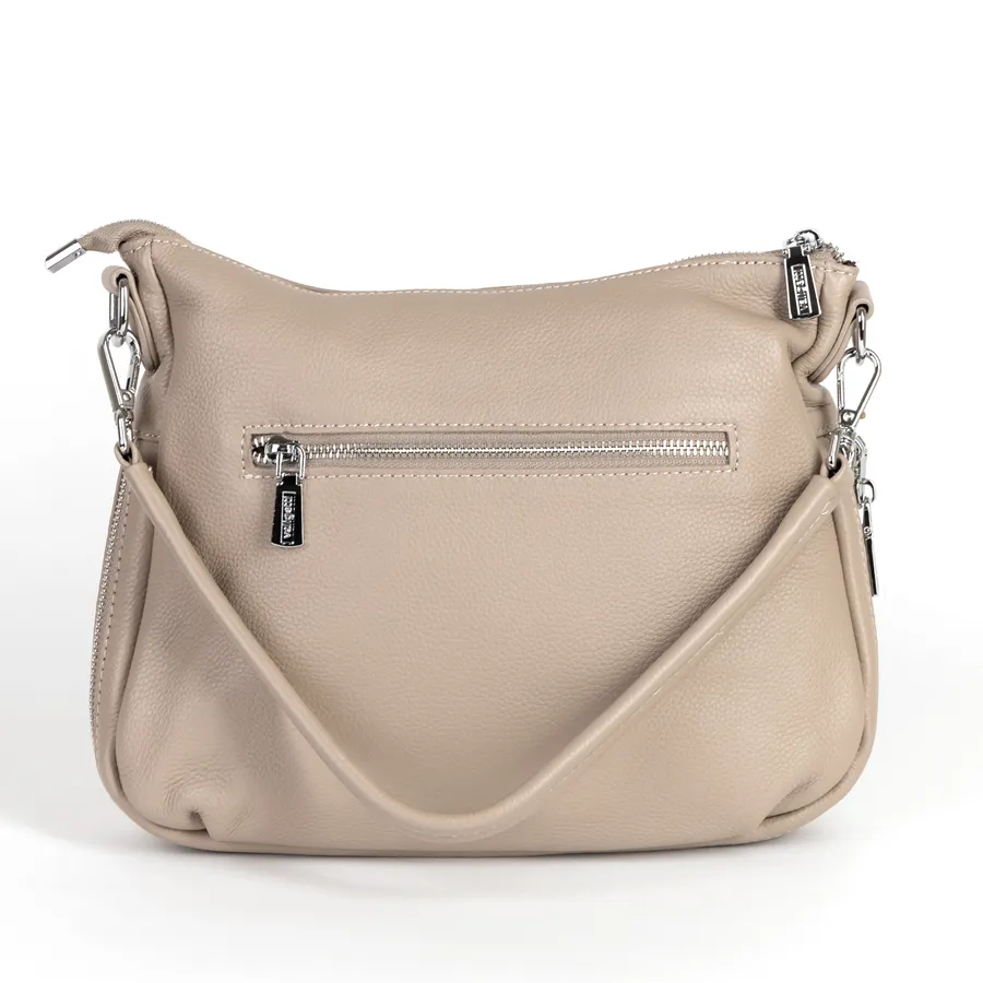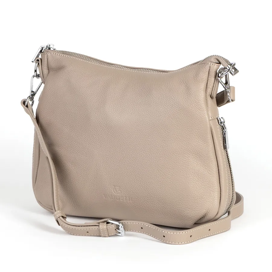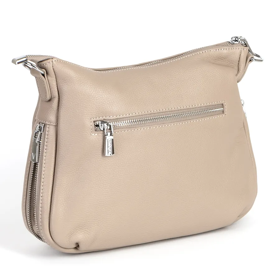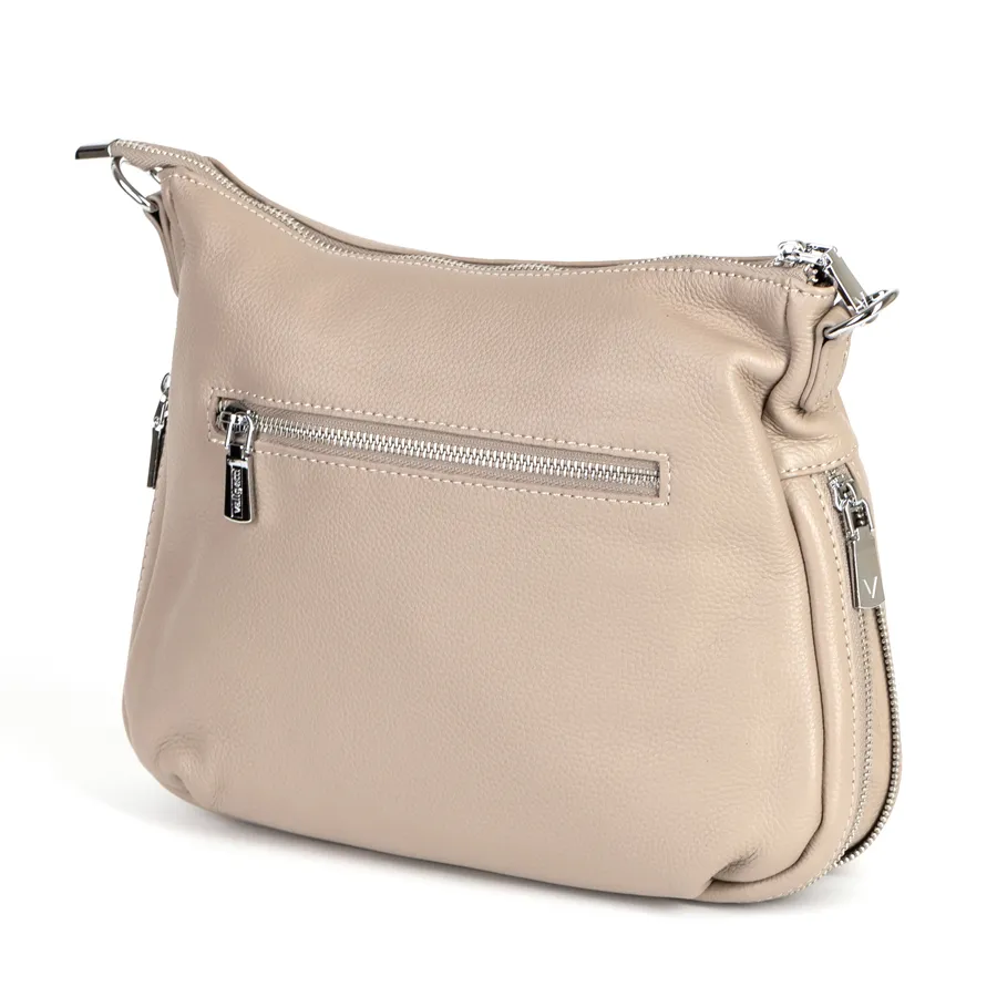 Сумка кросс-боди от бренда Valigetti выполнена из натуральной кожи в бежевом цвете. Модель со съемным регулируемым плечевым ремнем и съемной ручкой. Основное отделение на молнии, внутри: фирменная текстильная подкладка, накладной открытый карман, средний карман, боковой карман на молнии. На задней стороне сумки расположен карман быстрого доступа на молнии. Также сумка имеет расширение на молнии для увеличения объема.