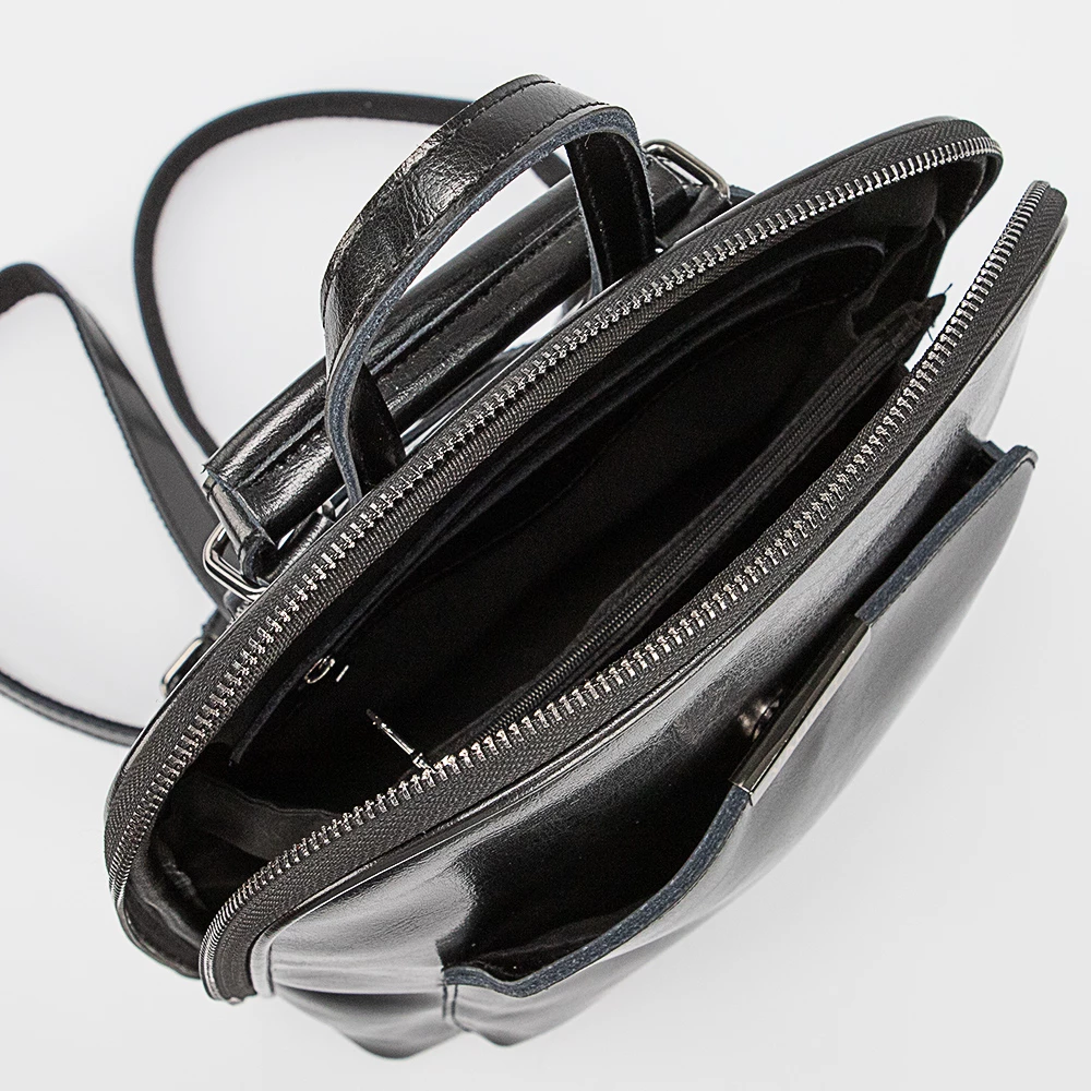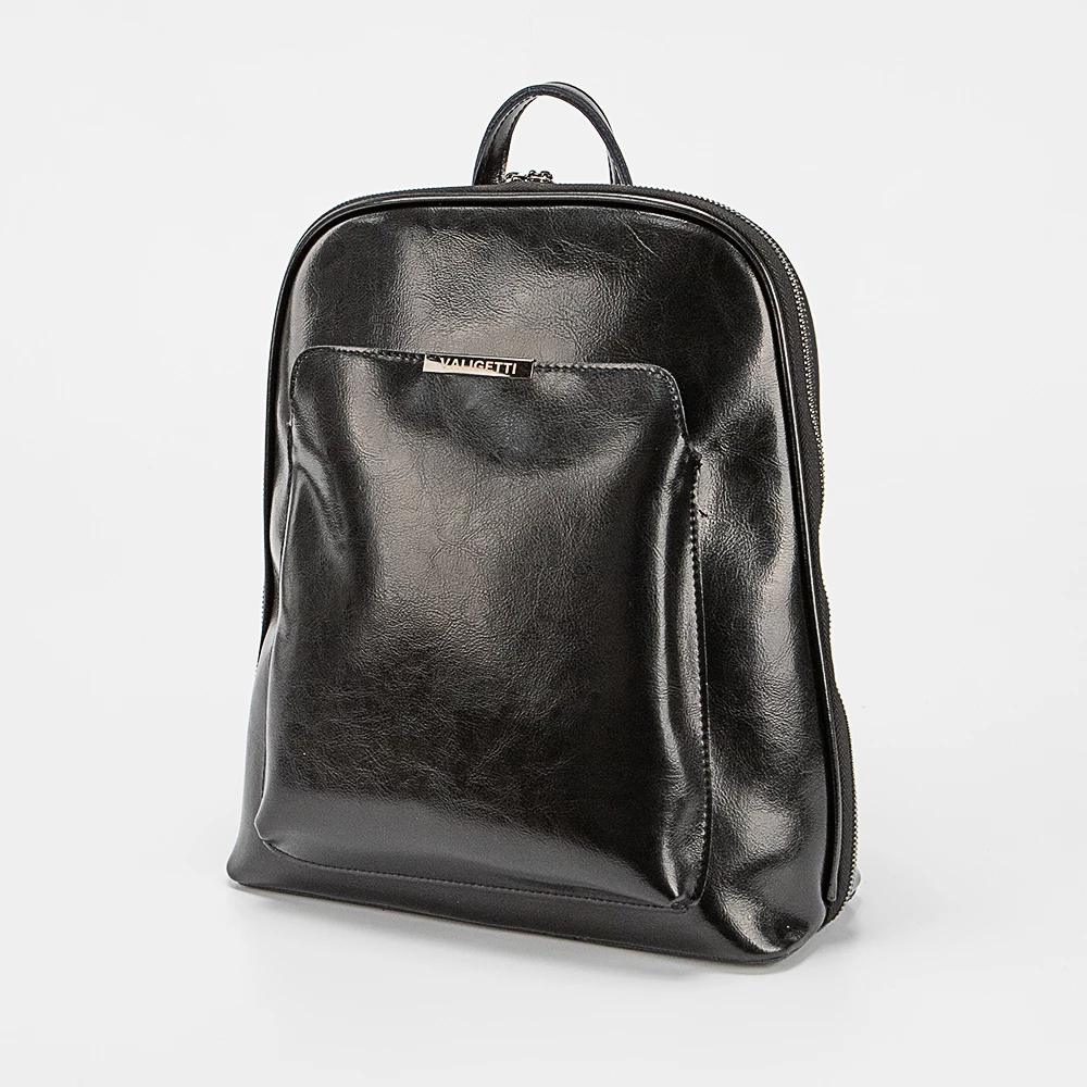 Сумка-рюкзак от бренда Valigetti выполнена из натуральной кожи черного цвета. Модель с лямкой-переноской и регулируемыми плечевыми лямками, которые стягиваются в плечевой ремень. Отделение на молнии по трем сторонам, что обеспечивает комфортный доступ. Внутри: фирменная подкладка, перегородка, карман на молнии, два накладных кармана. На задней стороне – прорезной карман на молнии. На передней стороне – накладной карман на магнитной кнопке.